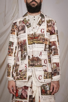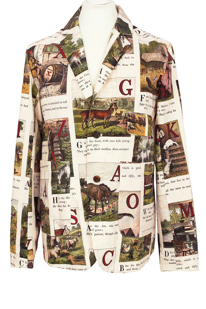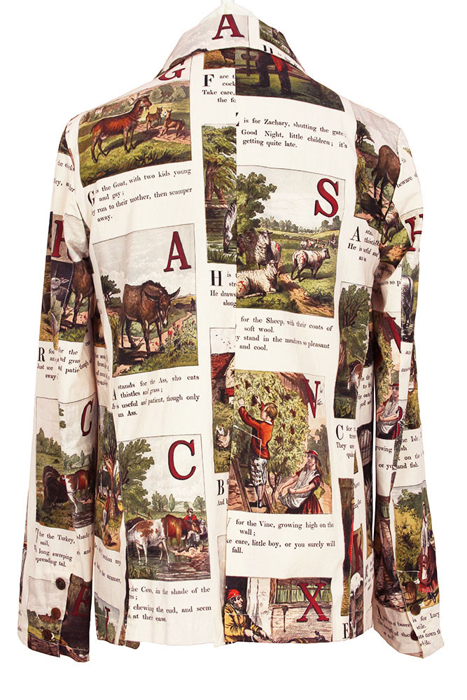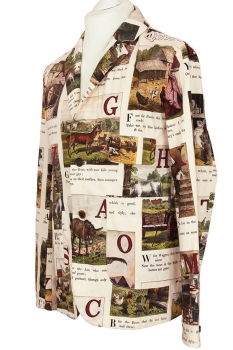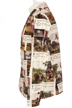 Aleksandr Manamis 2 button L'Alphabet print cotton fabric jacket. Collar with notch lapels and button at neck to create a round neck jacket. Left chest pocket with flap and 2 main patch pockets. 3 button, angled, working buttoned cuffs. Central vent at the rear. Mostly lined in 55% Linen 45% Cotton striped fabric. Both outer and lining is in fabric specially created for Aleksandr Manamis for this collection. 2 inside pockets. Stunning jacket!
