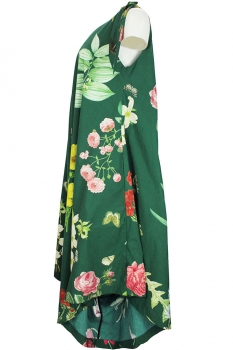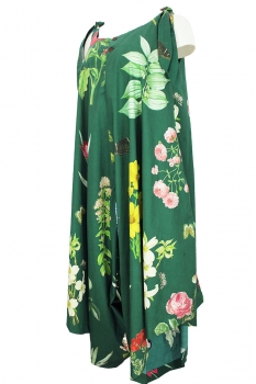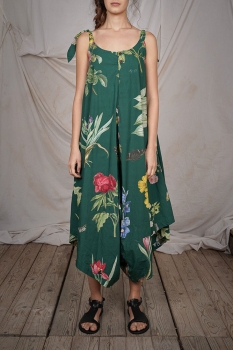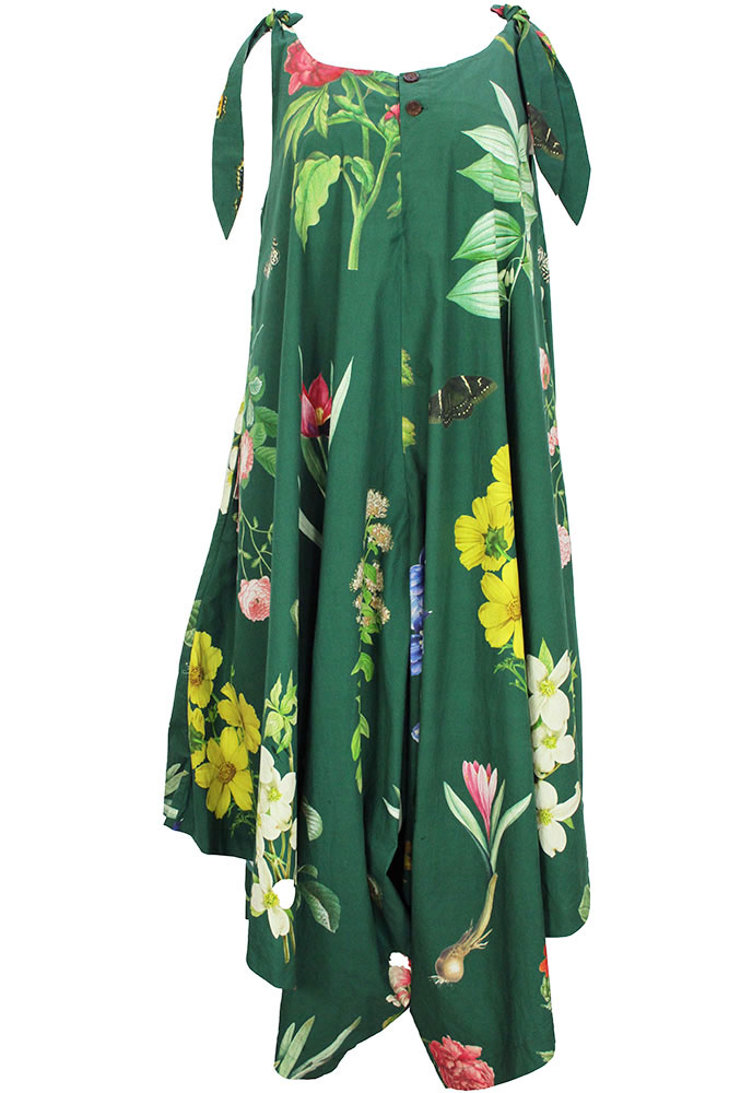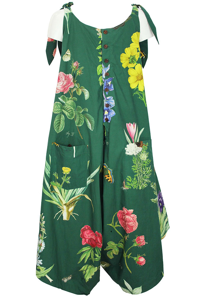 Aleksandr Manamis Sleeveless print cotton fabric jumpsuit in Jardin Vert print. Scoop neck with 2 button fastening. Fabric tie straps. 2 pockets in side seams. Very wide legs with angled hems. This garments is a large 'A' shape, with low crotch, which makes for a spectacular hang. At the rear there are 7 button fastenings, all with round leather inside reinforcers as with all Manamis buttons. There is also 2 rear patch pockets with button fastenings. This a stunning piece of clothing and a real show stopper!! Although sized small will fit s/m/l due to its very generous shape.