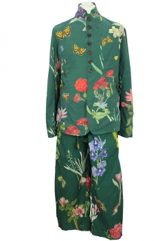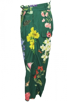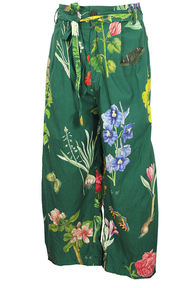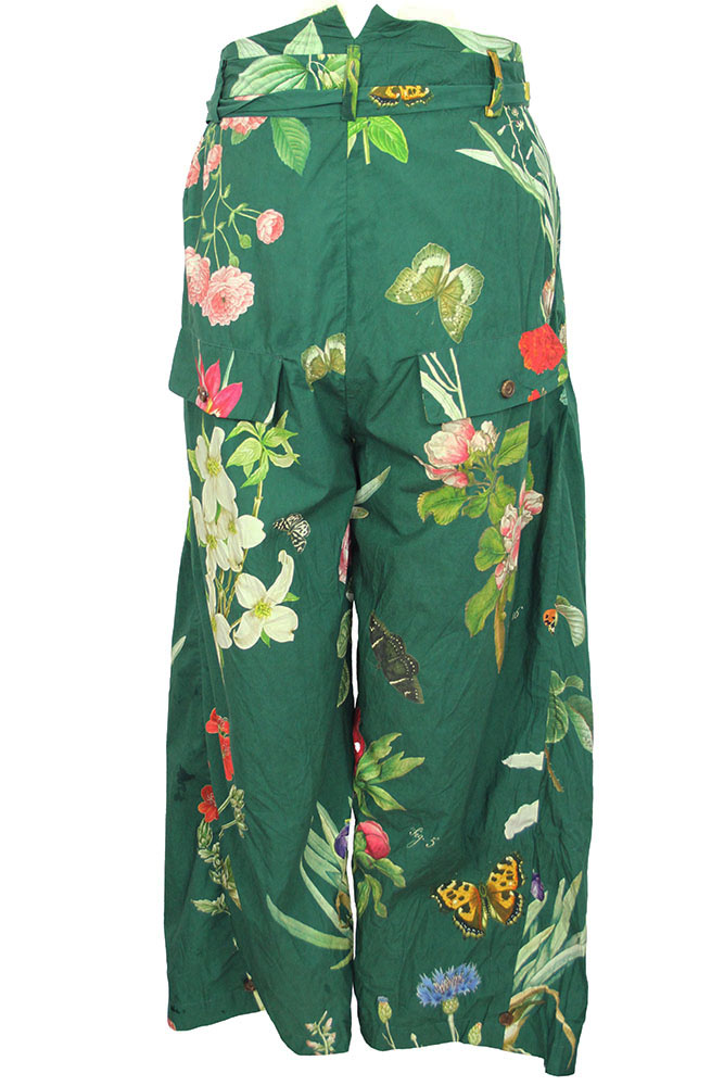 Aleksandr Manamis Full length, print cotton fabric, single pleat trousers in Jardin Vert print. Waistband with belt loops and fabric tie belt, raised rear with 'v' cut out. Single button fastening with leather reinforcer inside and zip fly with covering placket. 2 side pockets and 2 angled rear pockets with flaps and button fastening. Lined to the knees. Wide legged with finished hems.