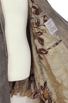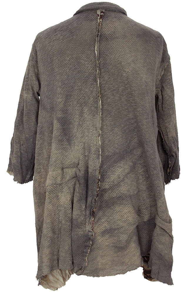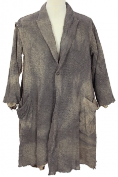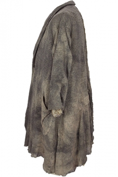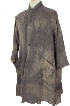 Chiahung Su distressed, mottled, hand dyed, handwoven mesh, oversized coat in uneven brown. Organic Japanese fabric. Single button fastening, button is handmade from old Taiwanese coin. Wide collar with stitched, notched lapels. 2 large patch pockets, with distressed trim. Very wide, for a beautiful drape. Raw edged hem and cuffs. The right sleeve has a visible, raw edged seam at the shoulder, which extends down to the cuff. At the rear there is a central, visible, raw edged seam and folded fabric detail in the left side. Inside there is a single pocket and the garment is fully lined in vintage, embroidered Japanese fabric.
