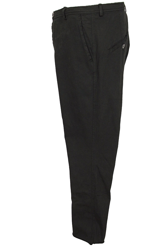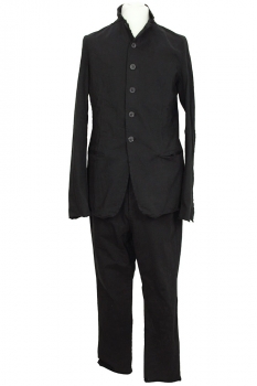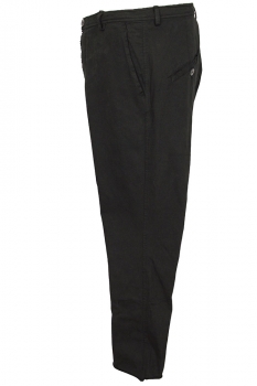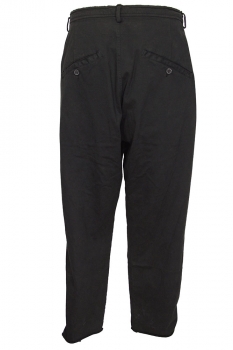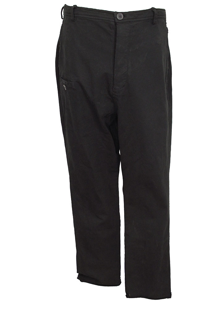 Rundholz Dip collection overdyed, tapered leg trousers in black cotton. Raw edged 3 layered waistband, with belt loops and single button fastening, with internal tab and button fastening. 4 button fly with covering double layered, raw edged placket. 2 angled side pockets, with raw edged trim. Right-side thigh pocket with finished trim and button fastening. 2 angled pockets at the rear, with finished trim and button fastening. Tapered legs and raw edged, rolled fabric hem. Matches the jacket in the black cotton.