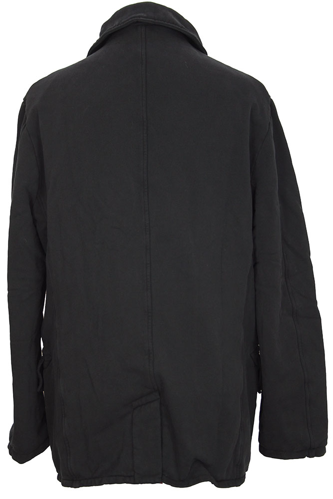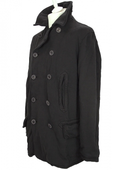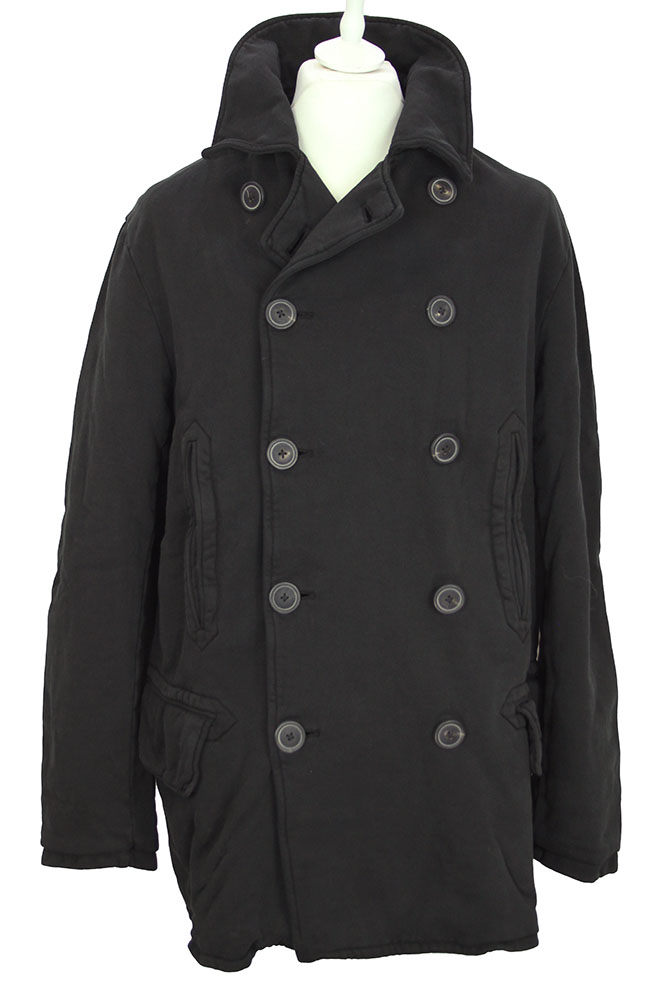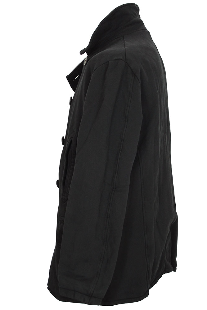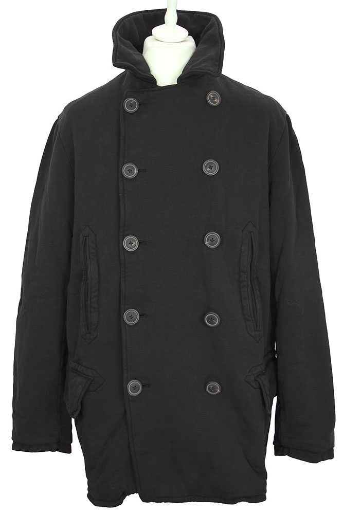 Rundholz Dip collection overdyed, heavy, double layered, double-breasted coat. Double layered collar. 2 columns of 5 buttons fastening. The garment can be button either way, left or right. 2 vertical, side pockets with finished trim and 2 main pockets with flaps and finished trim. Turned fabric finished cuffs. Short, central vent at rear. Single pocket inside. Fully lined in black cotton. A very substantial coat