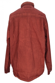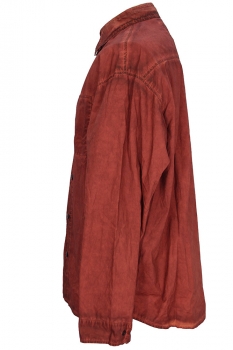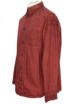 Rundholz Dip collection overdyed, distressed cotton shirt in crab cloud colour (dirty burnt orange). Pointed collar. 7 button fastening. Rectangular patch pocket on left chest. Cuffs have a finished cut out section with button fastening. Slightly curving hems. Box pleated at rear on each side.