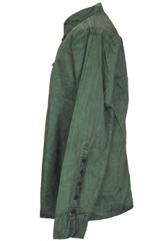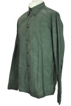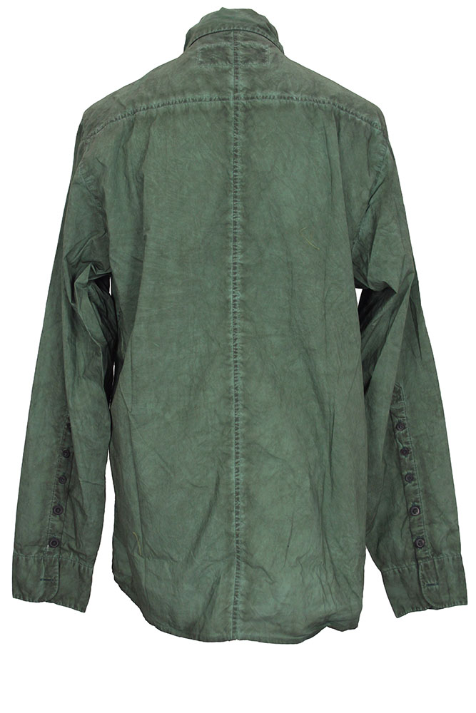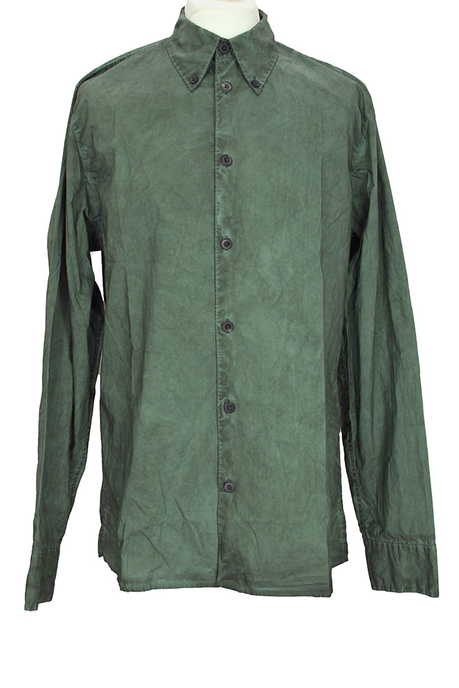 Rundholz Dip collection overdyed, distressed cotton shirt in pine cloud colour. Pointed collar. 7 button fastening. Extra long cuffs, with 6 button fastening, 3 small and 3 large. Straight finished hem, with small vents at each side.