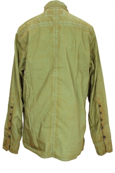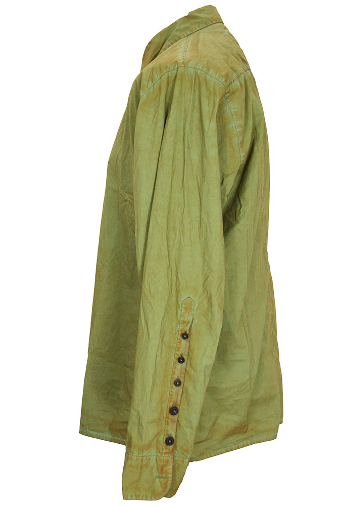 Rundholz Dip collection overdyed, distressed cotton shirt in lagoon cloud colour. Pointed collar buttoned down. 7 button fastening. Extra long cuffs, with 6 button fastening, 3 small and 3 large. Straight finished hem, with small vents at each side.