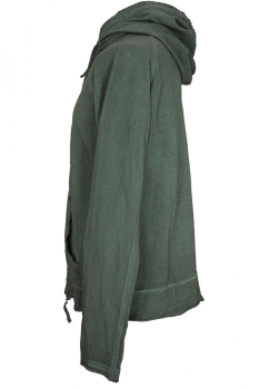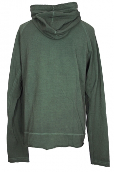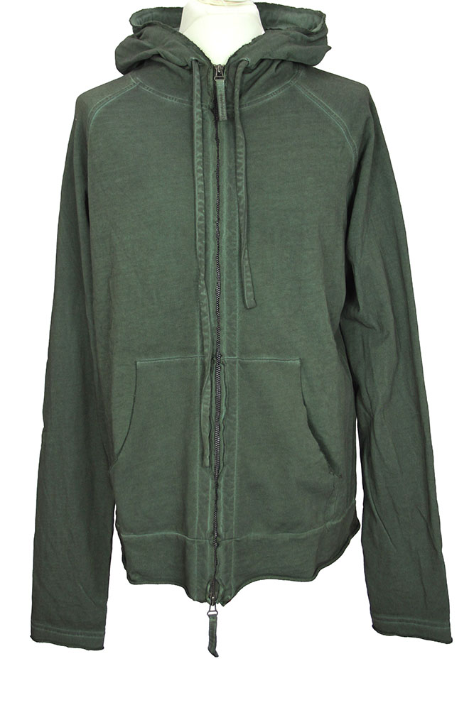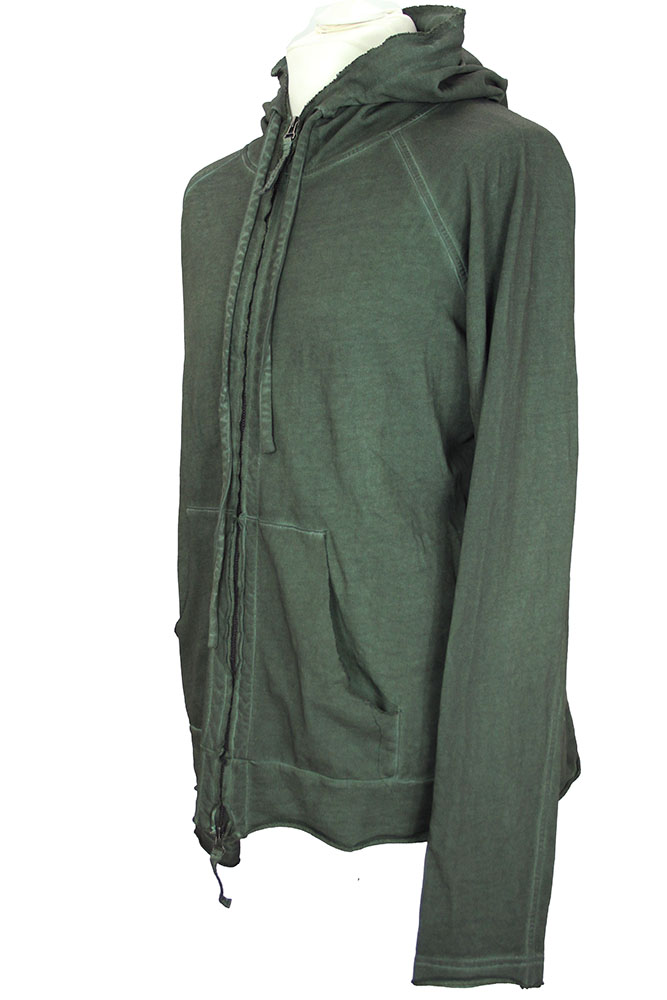 Rundholz Dip collection overdyed, distressed cotton, sweat, hooded, zip top in pine cloud colour. Hood with raw edges and fabric drawstring. Double zips with fabric pulls. Raw edged placket. Kangaroo, pouch pockets. Double layered, raw edged, rolled cuffs. Hem panel with raw edging and rolled fabric finish.