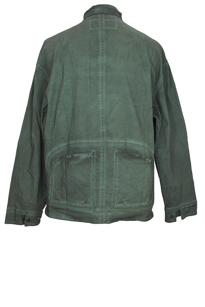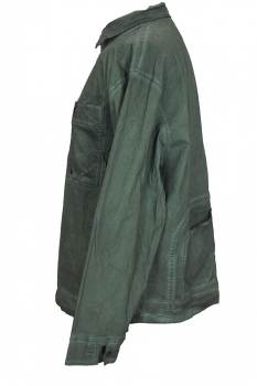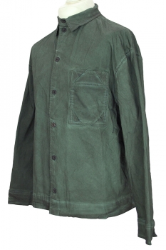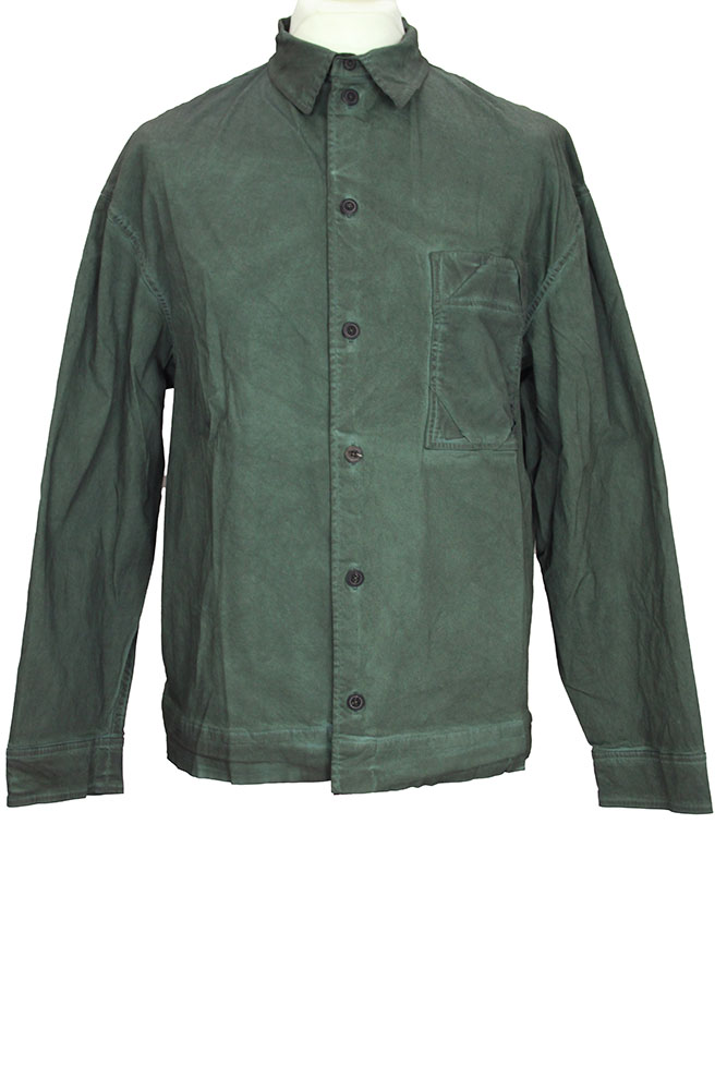 Rundholz Dip collection overdyed, distressed, stretch fabric Shirt/Jacket in pine cloud colour. Small collar, with single, small button fastening. 6 larger buttons fastening down the front. Rectangular, left-side, patch pocket, with triangular insets at each corner. Cut-away section on cuffs with single button fastening. 2 patch pockets at the rear, with triangular insets at lower corners and finishing trim.