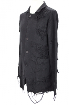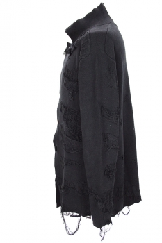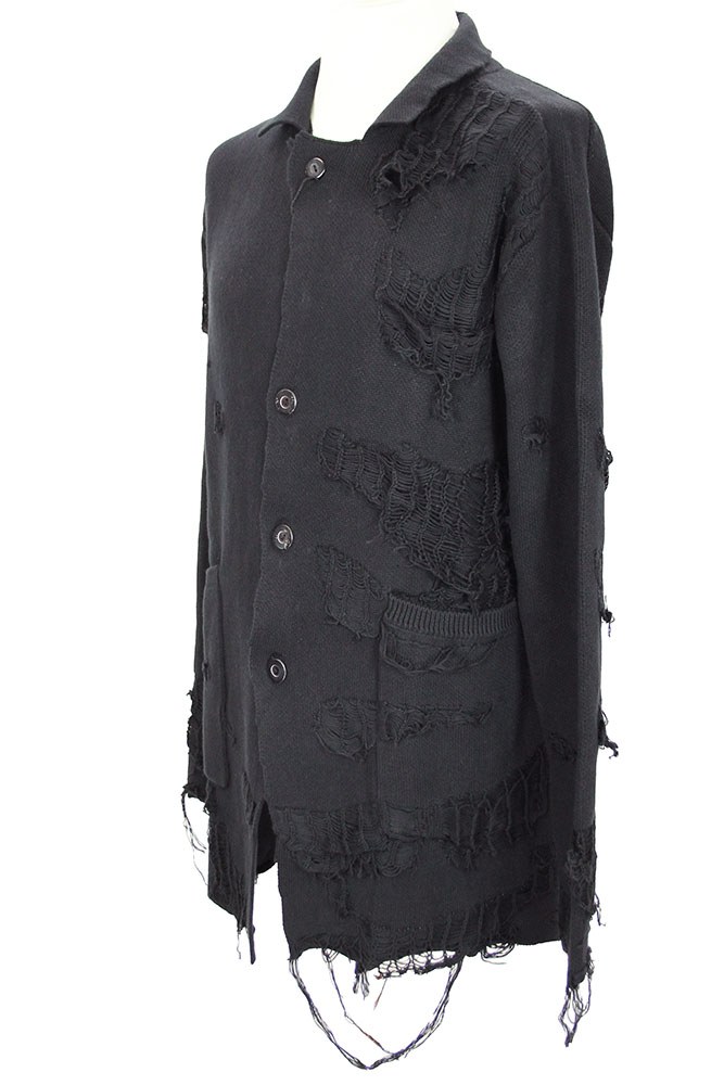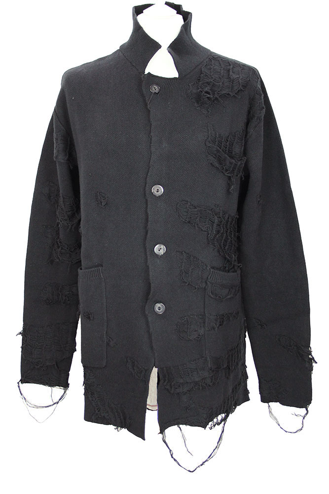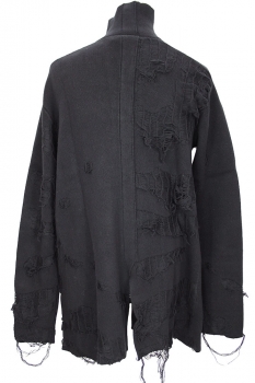 Nude:MM Oversized, knitted, long sleeved jacket style cardigan in black cotton and cashmere. Small soft collar. 4 button fastening. The knit is layered and the top layer has been cut and loosened in various areas, giving a distressed, worn look, very cool. The loosened threads display as a net of fibres and are found throughout the garment. The garment body is long. 2 patch pockets with distressing. Awesome piece of clothing.