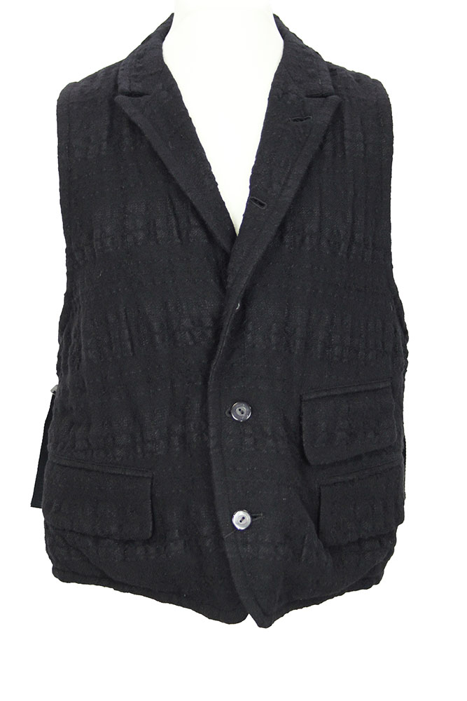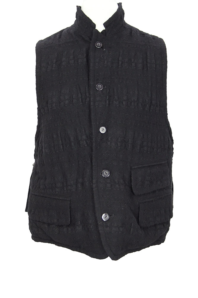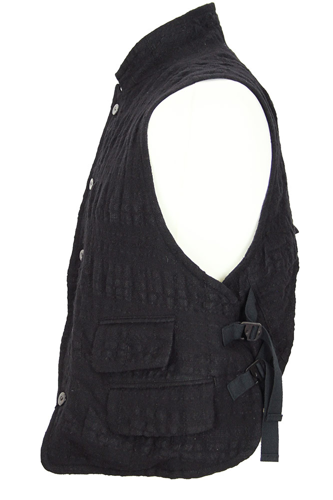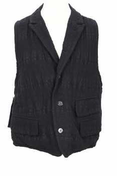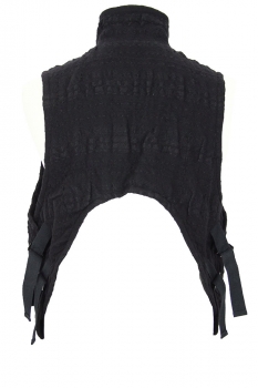 Nude:MM black waistcoat (vest) in wool/linen/cotton mix textured, heavy fabric. The garment can be worn as either a round neck, or as a collar with notched lapels, depending on how many buttons are fastened. 5 button fastening. 2 pockets on the front left panel, both with flaps and finishing trim. At each side there are 2 metal buckles with adjustable tapes to adjust the fit and which attach the rear panel to the front panels. The rear is a beautiful curved cut-away. Double layered fabric throughout.