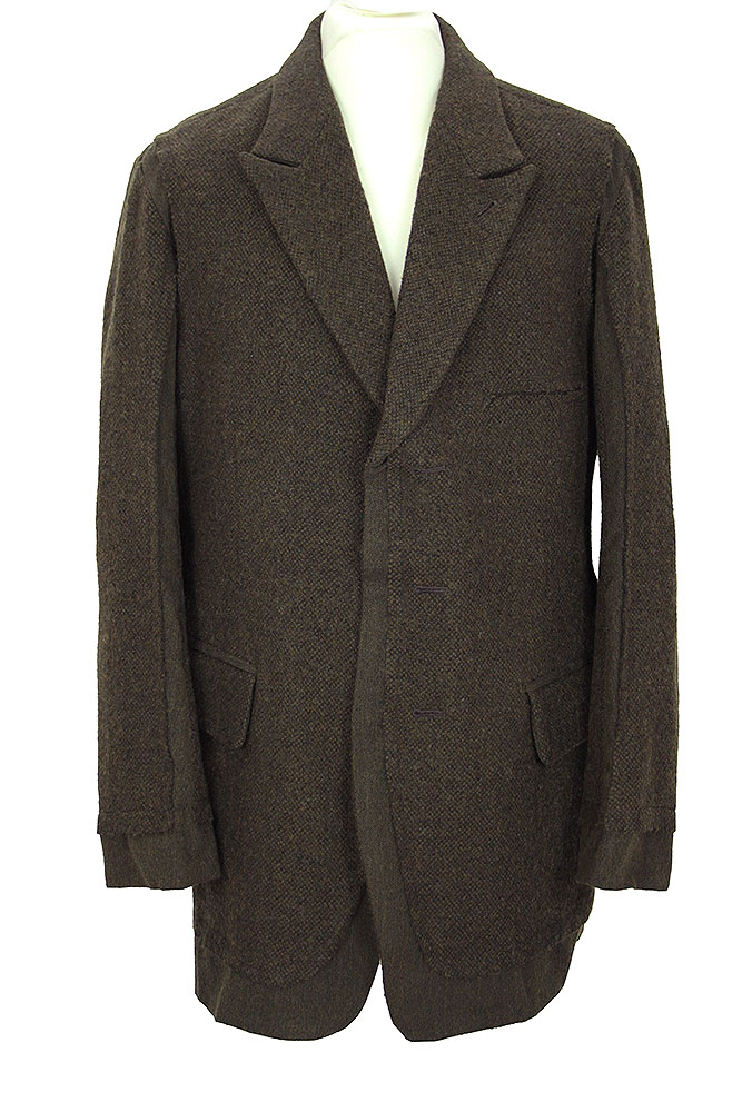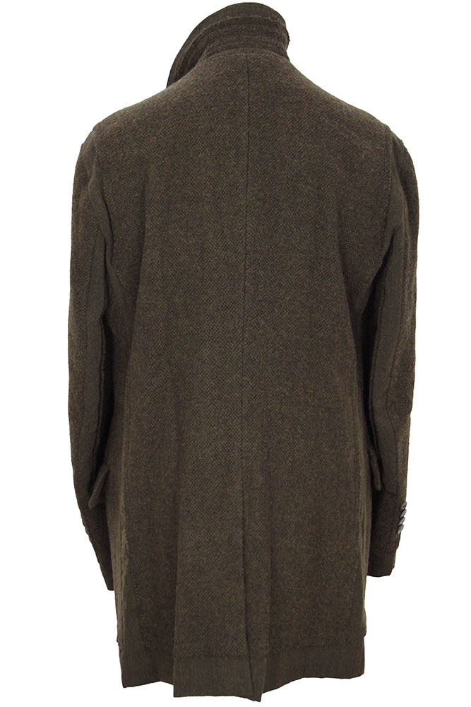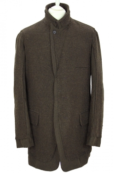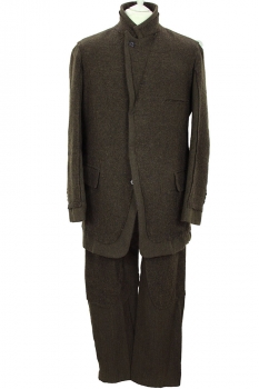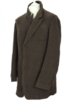 Nude:MM mixed fabric, long jacket in khaki brown wool/cotton mix. Collar with notched lapels. The car can also be used as a round collar, buttoned up to the neck. 3 metal popper fastening down the front. The fabrics used are a wide weave and a finer weave, giving great contrast and style to the piece. 2 main pockets with flaps and finishing trim. Raw edging and slash details throughout. Single vent at rear. Cuffs with 4 decorative buttons, raw edging and a panel from the finer weave fabric, turned and finished. The sleeves are lined in striped fabric. Fully lined in off-white cotton with black text and illustrations. 2 inside pockets. A beautiful jacket, which matches the trousers in the same fabric mix.