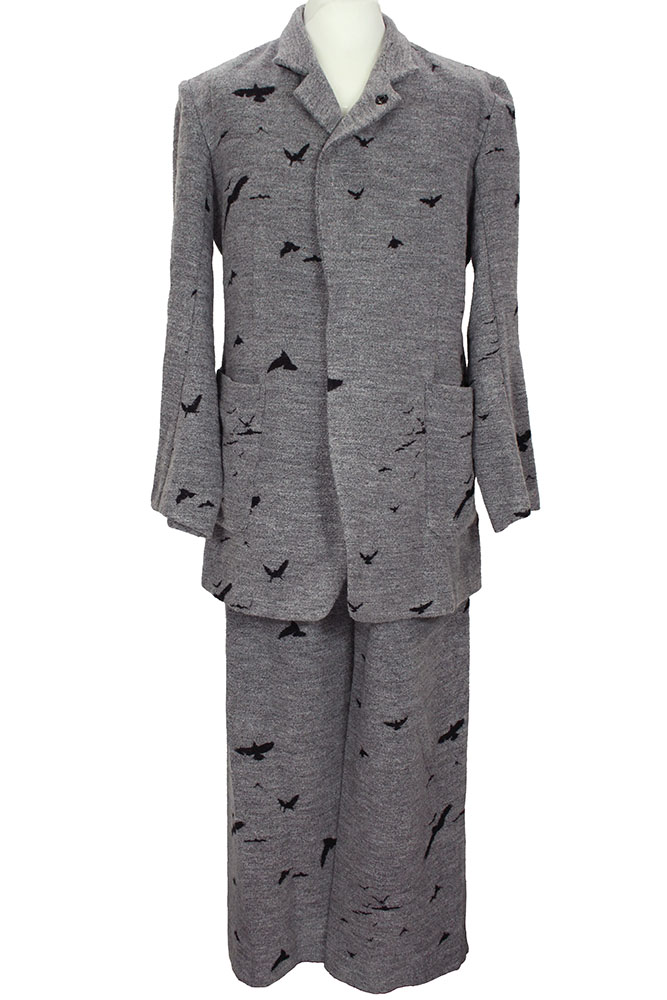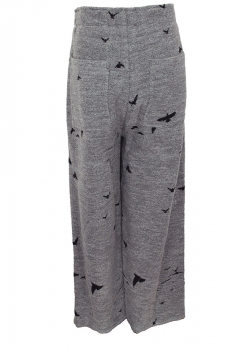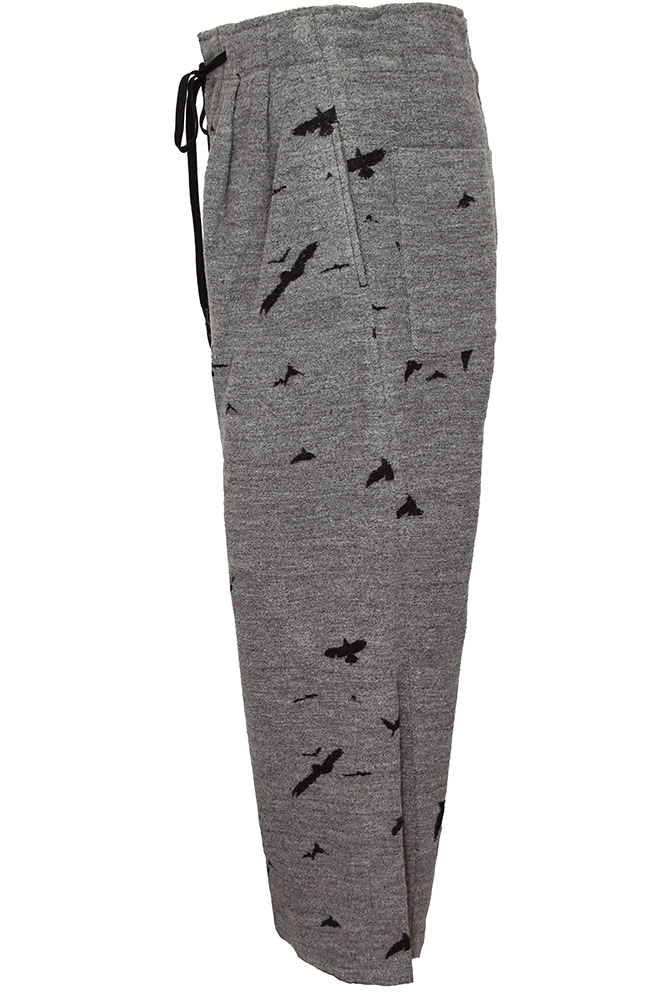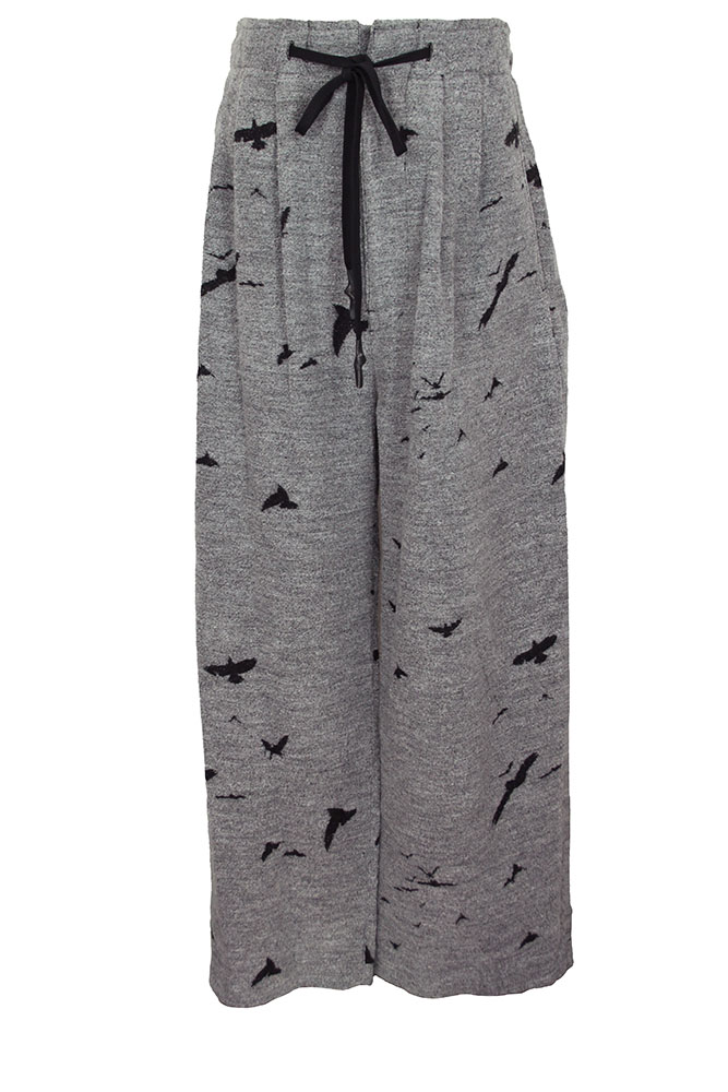 Nude:MM Super soft fabric, double pleat trousers in woven grey, with bird designs. Waistband with black, shoelace style drawstring. Single metal popper fastening and zip fly with covering placket. 2 side pockets with finishing trim. 2 large patch pockets at the rear. Wide legged with plain, turned hems. Beautiful trousers in a spectacularly soft and comfortable fabric. Matches the jacket in the same fabric.