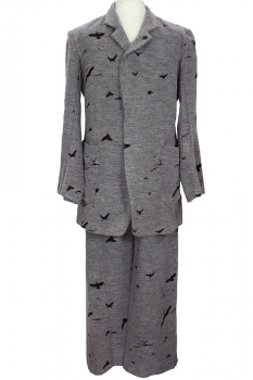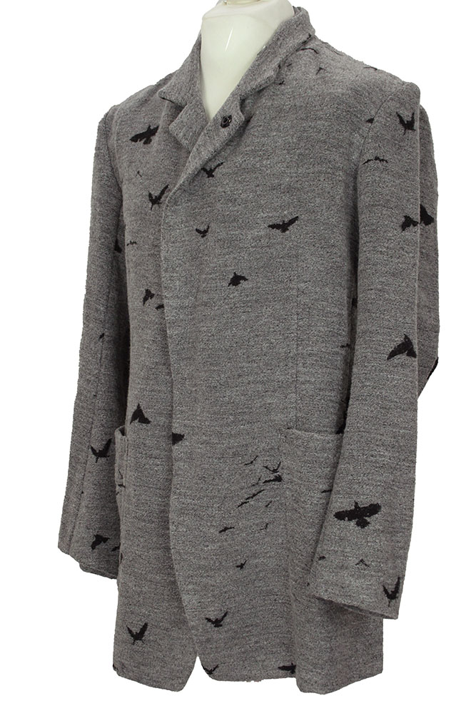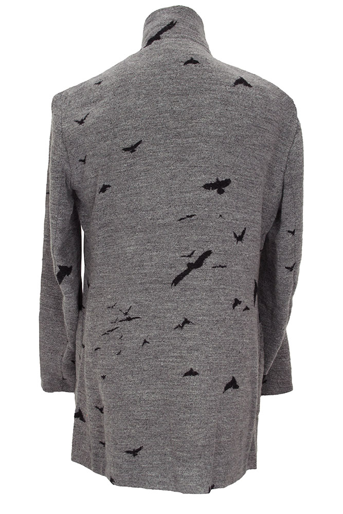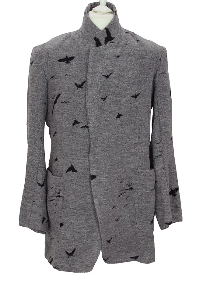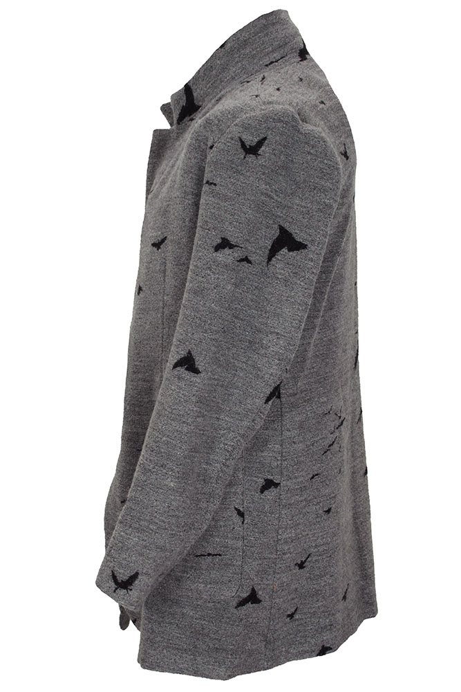 Nude:MM Super soft fabric, long jacket in woven grey, with bird designs. Collar with notched lapels, but can also be fastened as a raised round collar. 5 metal popper fastenings at the front. 2 large patch pockets. Plain turned cuffs. 2 inside pockets. A stunning jacket that matches the trousers in the same fabric.