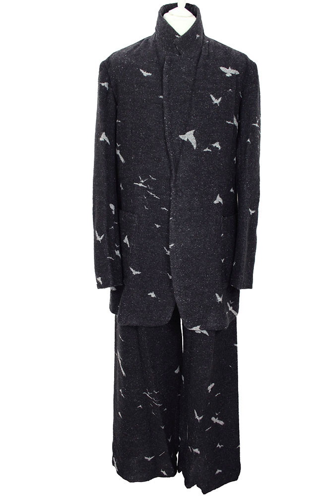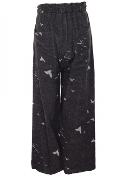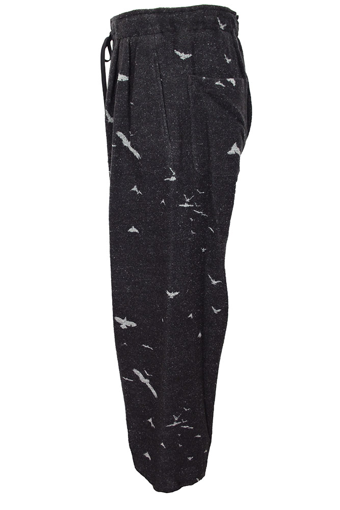 Nude:MM Super soft fabric, double pleat trousers in woven black, with grey bird designs. Waistband with black, shoelace style drawstring. Single metal popper fastening and zip fly with covering placket. 2 side pockets with finishing trim. 2 large patch pockets at the rear. Wide legged with plain, turned hems. Beautiful trousers in a spectacularly soft and comfortable fabric. Matches the jacket in the same fabric.