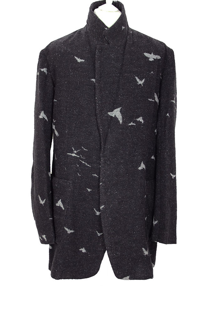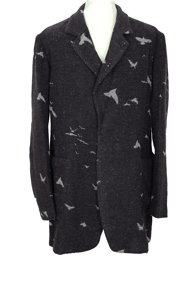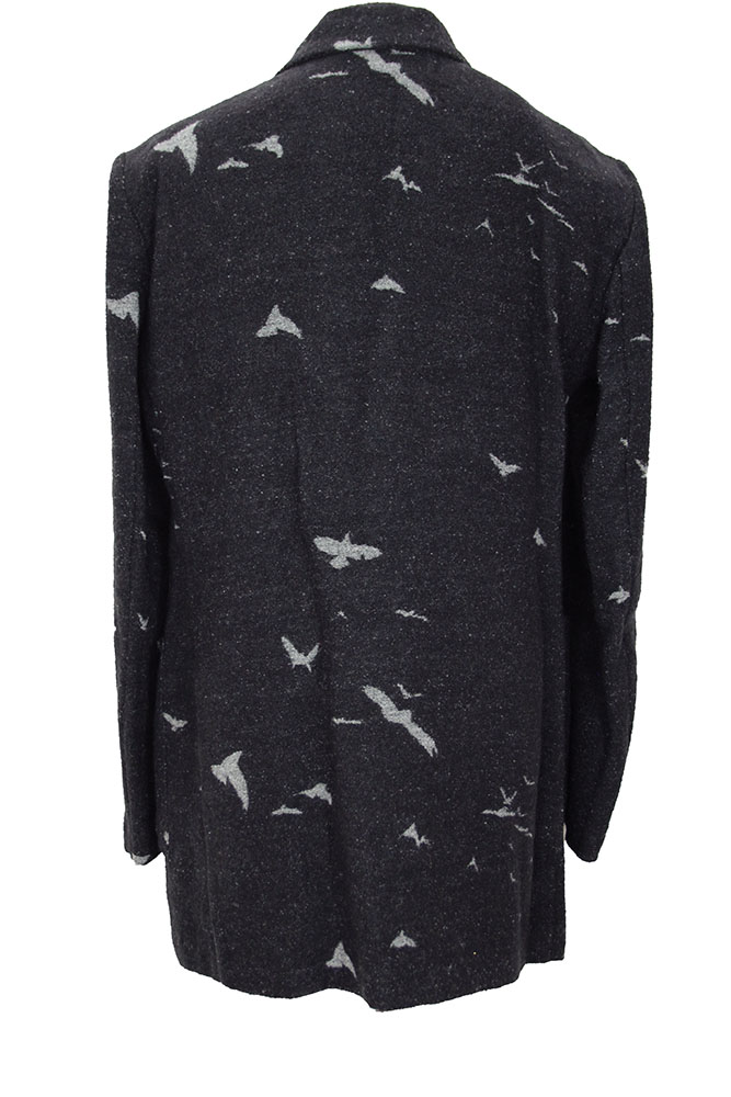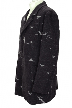 Nude:MM Super soft fabric, long jacket in woven black, with grey bird designs. Collar with notched lapels, but can also be fastened as a raised round collar. 5 metal popper fastenings at the front. 2 large patch pockets. Plain turned cuffs. 2 inside pockets. A stunning jacket that matches the trousers in the same fabric.