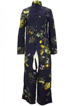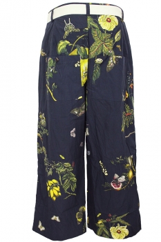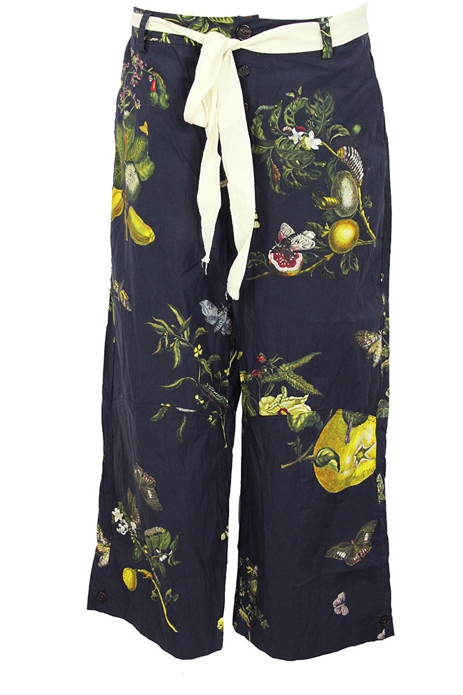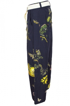 Aleksandr Manamis wide legged trousers in Natura Bleu Print (Floral Print) with fabric belt in natural colour. Waistband with belt loops. 4 button fly with visible buttons, all buttons have leather reinforcing buttons inside. 2 angled side pockets. 2 rear patch pockets with finished trim and button fastening. Fully lined in off-white cotton, which very slightly extends below the hem. All inside seams are taped French seams. Gorgeous trousers that match the jacket and shirt in the same print.