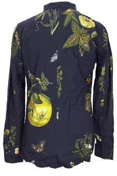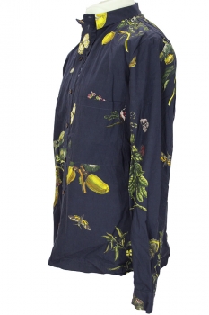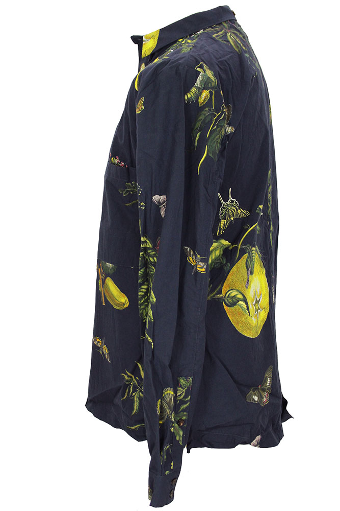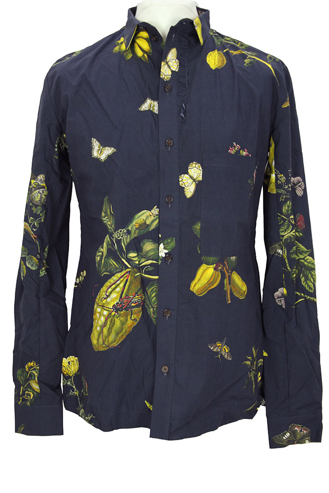 Aleksandr Manamis long sleeved shirt in Natura Bleu Print (Floral Print). Small, double layered soft collar and single button at collar rear. 8 button fastening on placket, with small ruffle at top of left side placket, with raw edging. Left side, patch pocket. Raw edged hem with stitch detail. 3 button classic cuffs. All buttons with inner leather, button reinforcers. Great shirt that matches the trousers and the jacket in the Natura Blue Print.