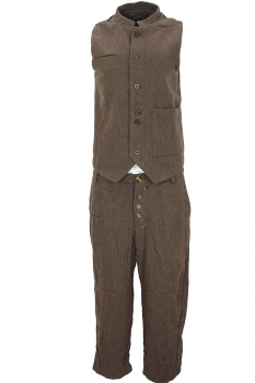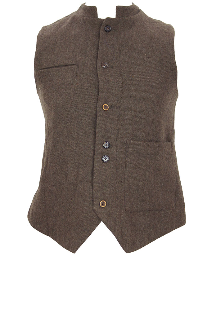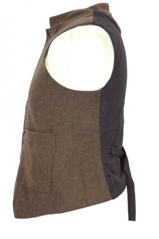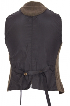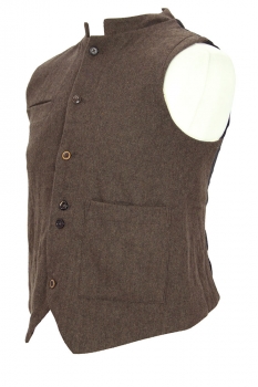Aleksandr Manamis heavy twill, waistcoat (vest) in vintage Wren Colour (khaki brown). Raised, double layered round collar. 6 button fastening down the front with 2 styles of buttons. All button have inside leather reinforcers. Right chest pocket with finishing trim and single patch pocket on left side. Longer at the front, with pointed hem. Rear panels are in black fabric and there is a half belt with button fastening in the same fabric, also small 'V' vent at central rear hem. Fully lined in cotton printed, floral fabric. All seams are finished. Sized a 3 but is really a 2 (small)