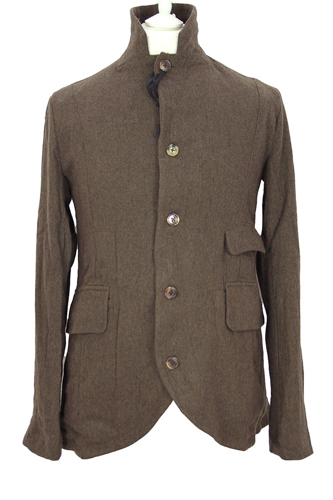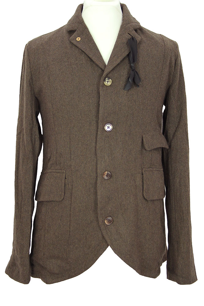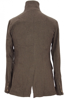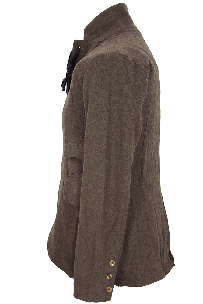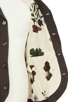 Aleksandr Manamis heavy twill, 5 buttoned, cut-away style jacket in vintage Wren Colour (khaki brown). The collar can be worn as a high round neck or collar with notched lapels. 5 buttons including the button at the collar, all buttons with inside leather reinforcers. Black fabric piece, through top buttonhole, this can be removed if preferred. Small pocket with flap on left side and 2 main pockets with flaps, all with finished trim. 3 button working cuffs. Single central vent at the rear. 3 pockets inside and the garment is fully lined in floral print cotton. Matches the garments in the same fabric.
