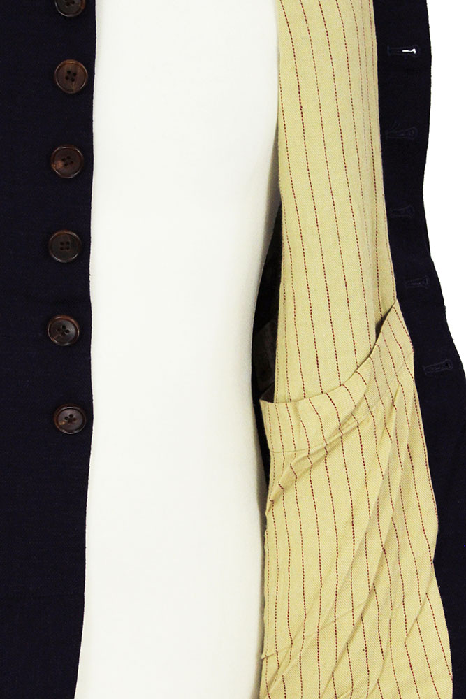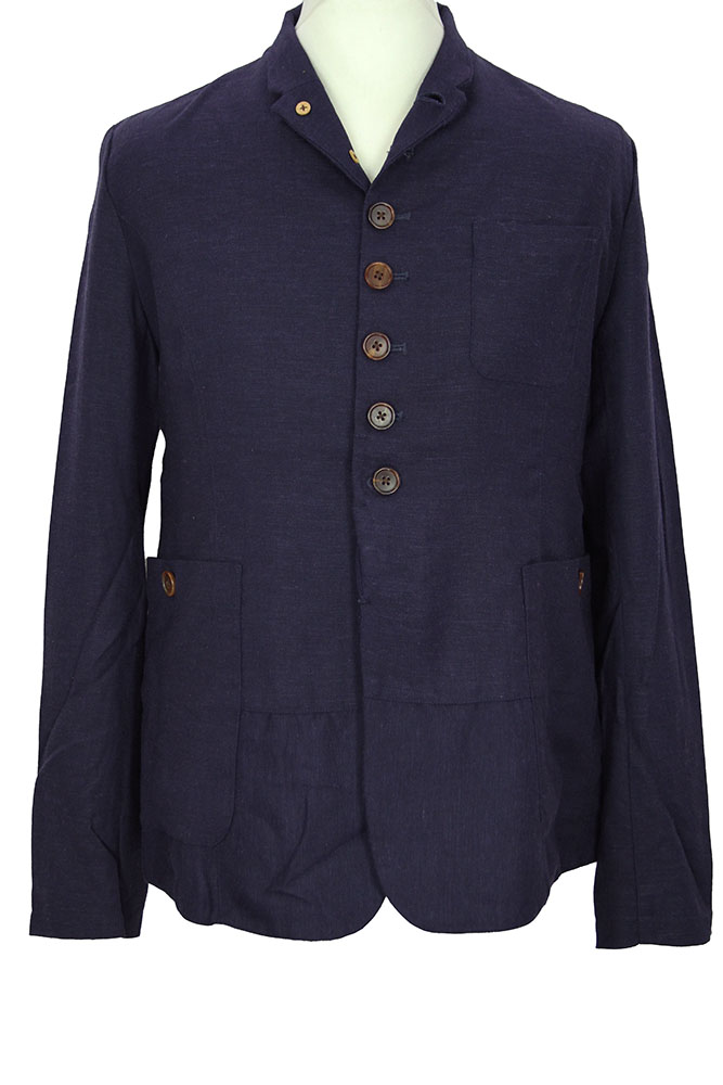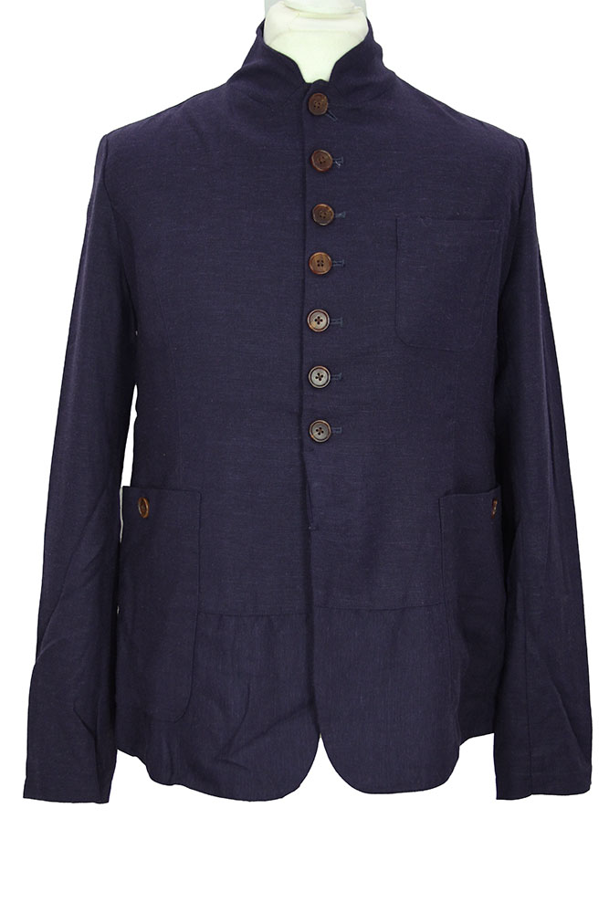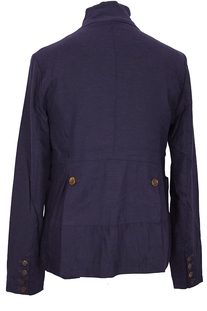 Aleksandr Manamis heavy, soft linen jacket in Cordelia Blue with stunning, overdyed, substantial, striped cotton lining. The collar can be worn as a round collar or as a notched lapel collar. 8 button fastening with lowest hidden behind the placket, all buttons have inside leather reinforcers. Left-side chest patch pocket and 2 main pockets, with finishing trim and button fastening. 4 button working cuffs. Double vent at rear with central panel with buttons detail. 3 inside pockets using the beautiful cotton lining. Matches the tapered trousers in the same fabric to create a wonderful suit.