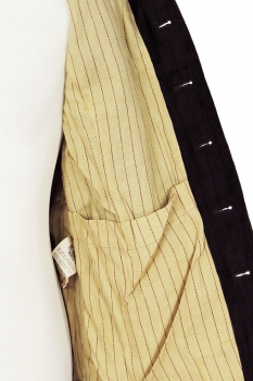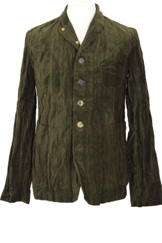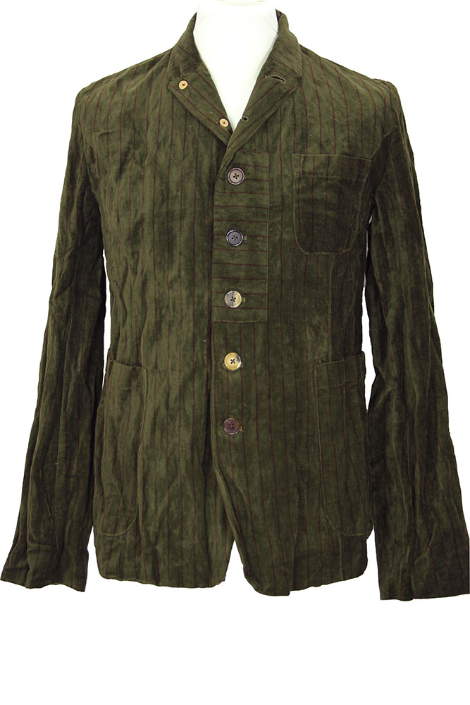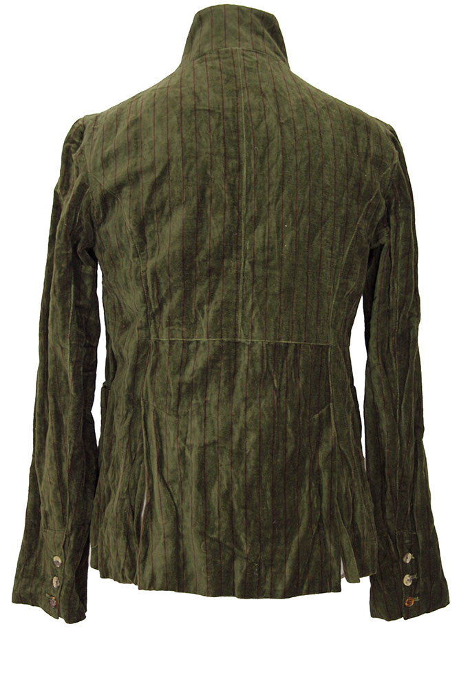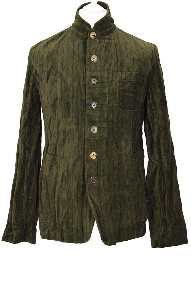 Aleksandr Manamis Unisex, heavy, burgundy striped, dark green, crushed velvet, 7 button jacket. The collar can be worn as a high round collar or as a notched lapel. 7 buttons of same shape and of various shades, all buttons have inside leather reinforcing buttons. The middle 3 buttons have a fabric inset with the stripes on the horizontal. Left-side chest patch pocket and 2 main patch pockets. Double vent at rear. 3 button working cuffs. Fully lined in the beautiful, overdyed striped cotton fabric and with 3 pockets inside. This is a totally gorgeous jacket that matches the inspired trousers in the same fabric, creating a fantastic suit!!