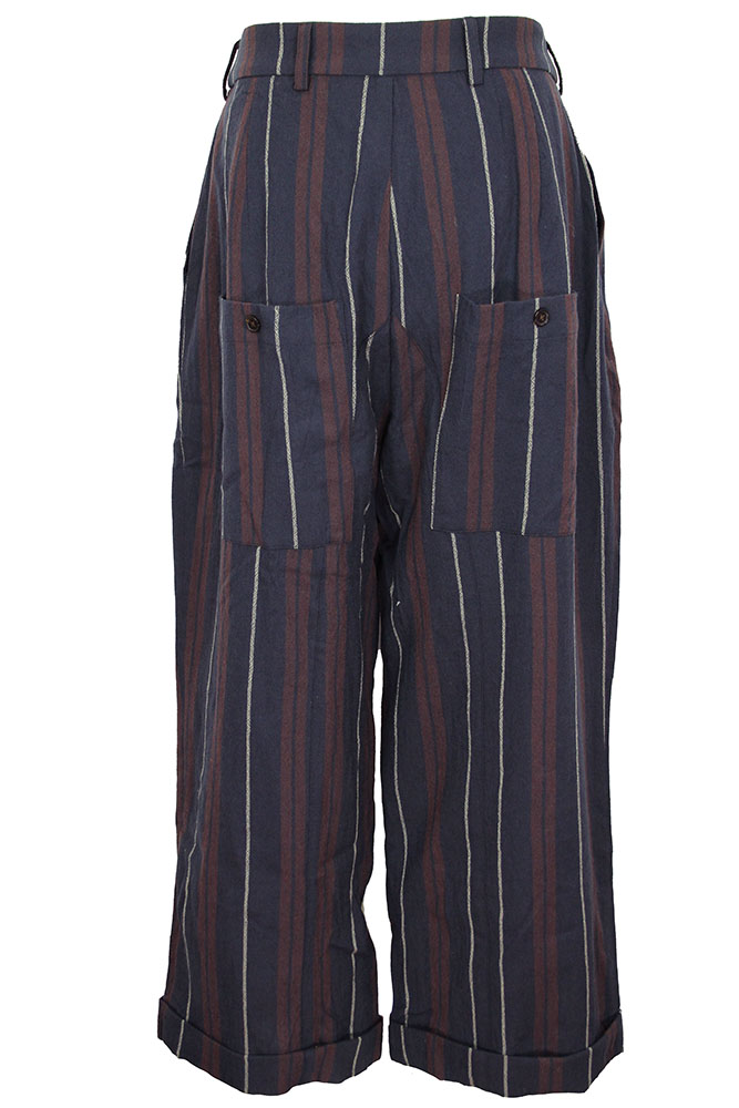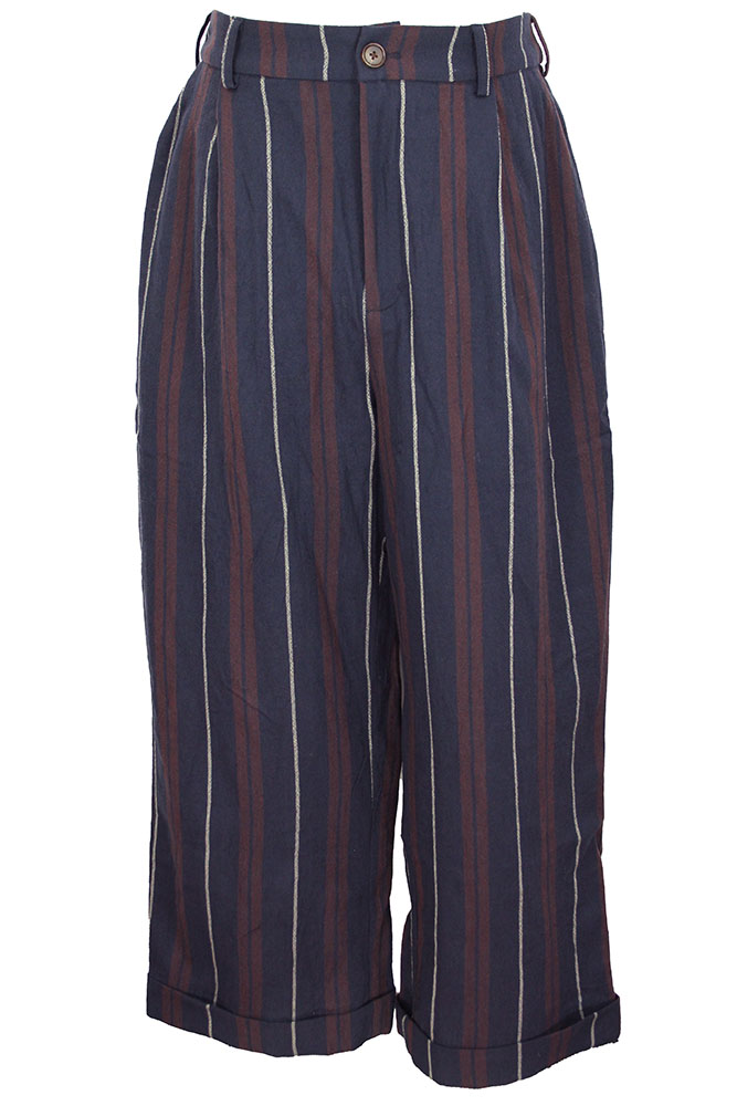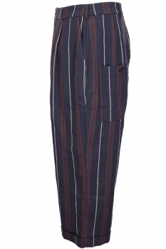 Aleksandr Manamis striped, single pleat, wide-legged trousers, with turn-ups in 100% wool, red, blue and grey stripes. Double layered waistband, with belt loops and single button fastening, all buttons have inside leather reinforcing buttons. Zip fly with covering placket. Angled side pockets and 2 large rear patch pockets with finishing trim and button fastening. Fully lined in blue floral print cotton.