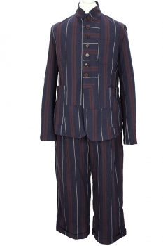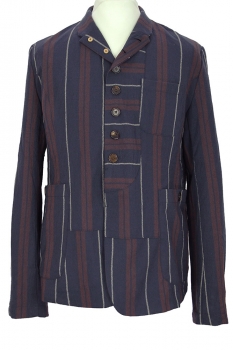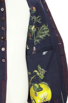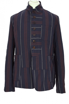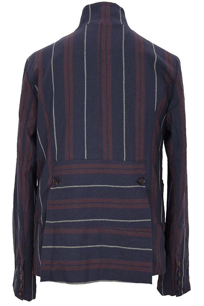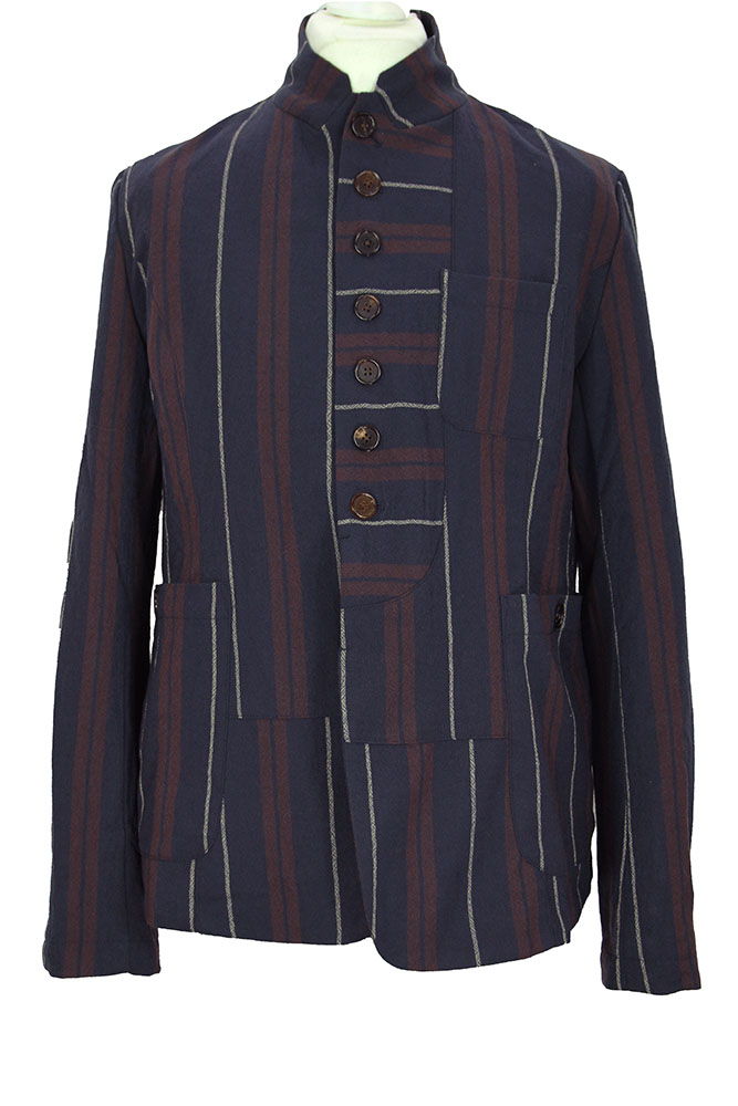 Aleksandr Manamis striped, wool, cut-away style jacket in red, blue and grey stripes. The collar can be worn as a high neck or as a notched lapel. 8 Button fastening, all buttons have inside leather reinforcing buttons. The lowest button is hidden behind the placket. The garment is constructed with panels some with some panels vertical striped and some horizontal striped. Left-side chest patch pocket and 2 large, main patch pockets with button fastening. 4 button working cuffs. Double vented at the rear with a central panel and button detail. Fully lined in dark cotton floral and insect printed fabric. 3 pockets inside. This brilliant jacket matches the trousers in the same fabric, creating a glorious suit