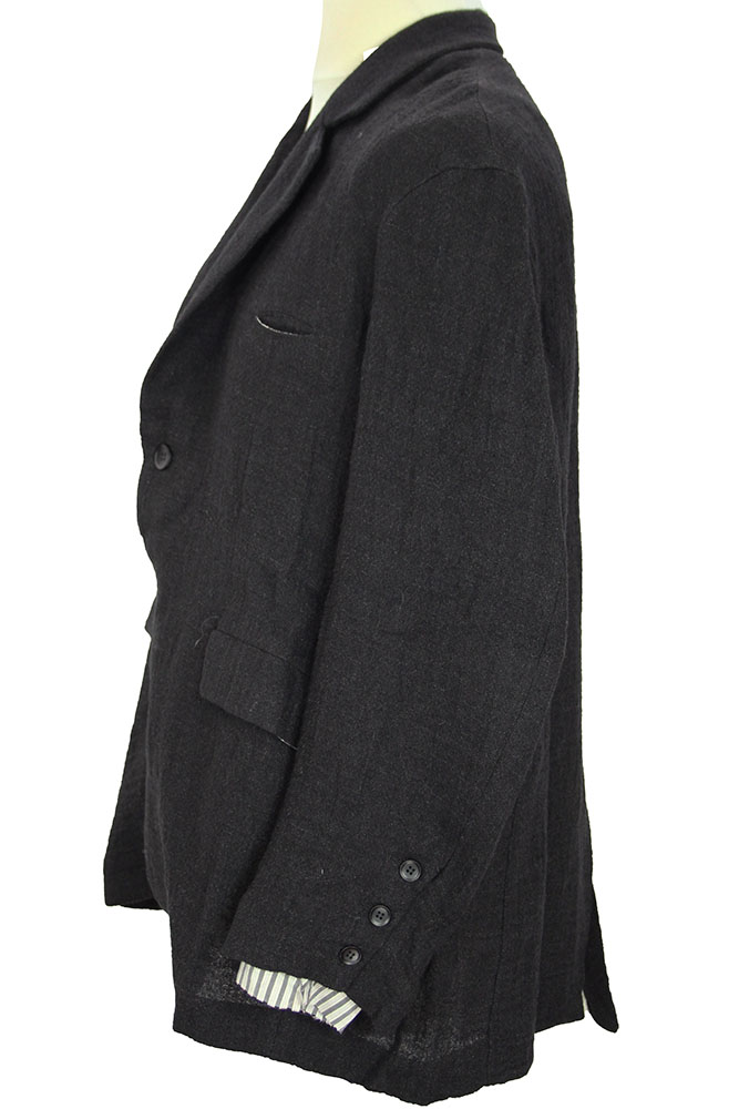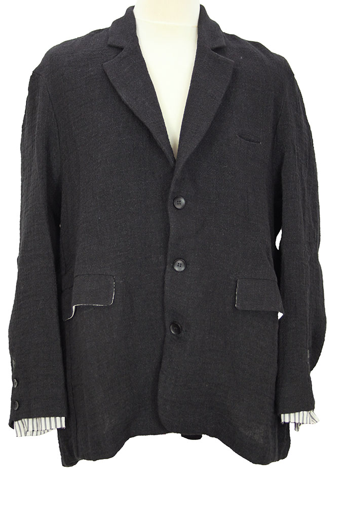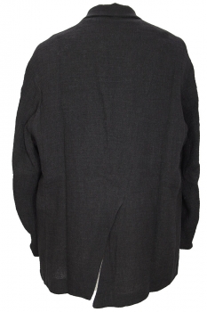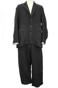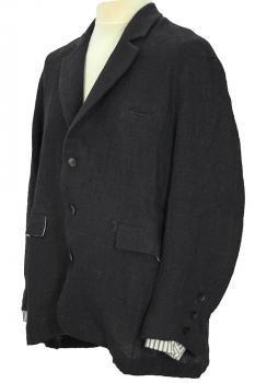 Marc Point 3 button jacket in charcoal coloured linen/cotton/wool mix. Collar with long notched lapels. Tiny oval entry left-side chest pocket and 2 main pockets with flaps. Pockets have light coloured textured lining, which looks great against the charcoal. 3 button, angled working cuffs. Central vent at rear. Fully lined in the light, off-white textured fabric and the sleeves lined in striped fabric, extending below the cuffs. Superb jacket which matches the trousers in the same fabric.