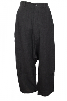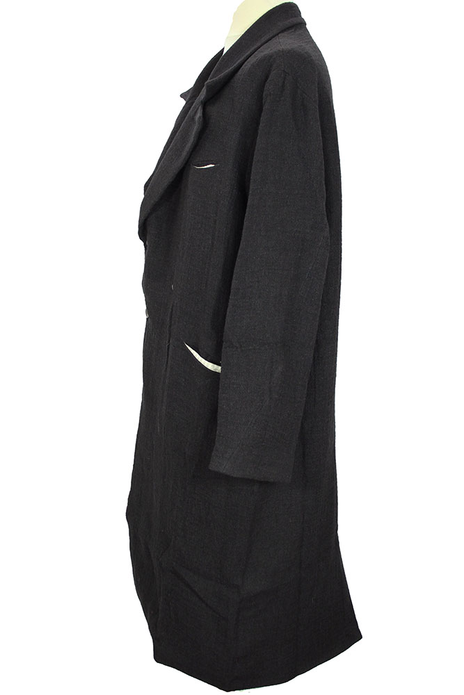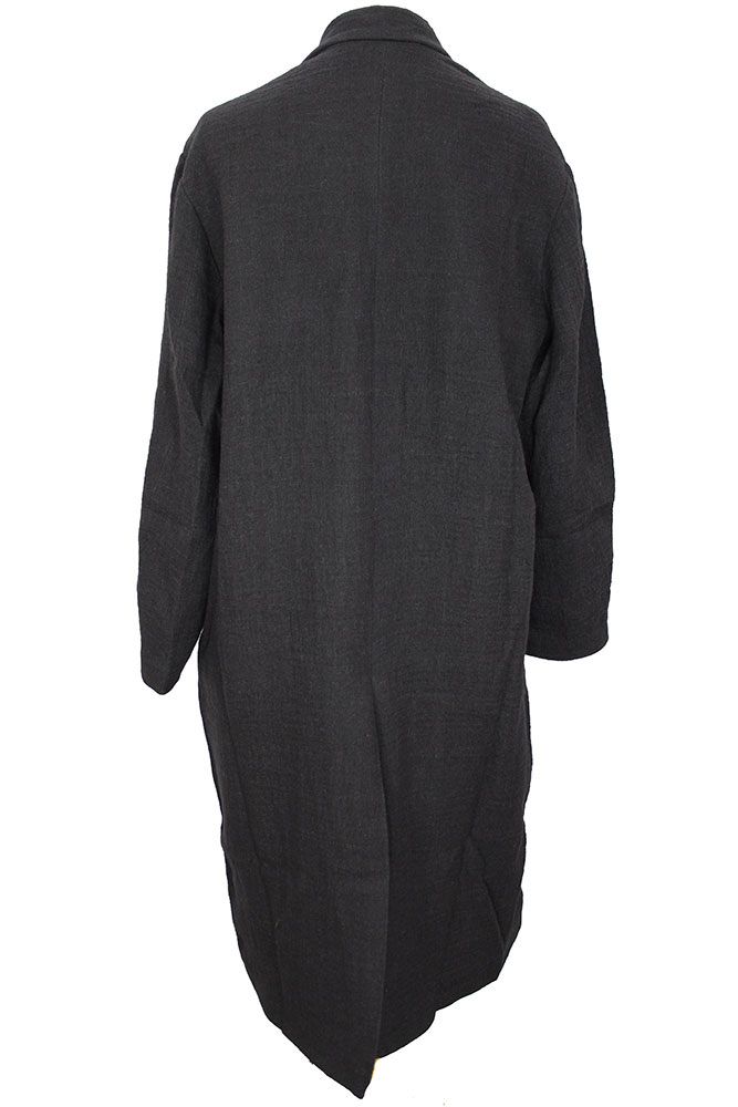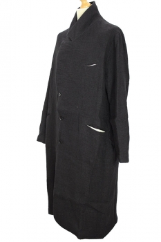 Marc Point 3 button coat in charcoal coloured linen/cotton/wool mix. Large collar with long, curving notched lapels. Tiny oval entry left-side chest pocket and 2 main pockets with flaps. Pockets have light coloured striped lining, which looks great against the charcoal. Plain, finished cuffs. Long central vent at rear. Fully lined in the light, striped cotton fabric and the sleeves lined in black fabric. Superb coat which matches the trousers and jacket in the same fabric.