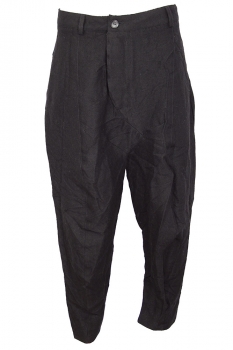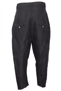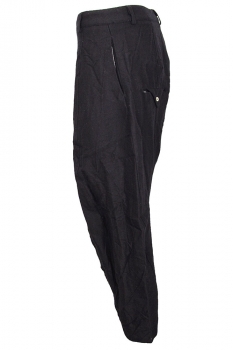 Marc Point tapered trousers in a beautiful textured fabric, with crinkle and stitch detail. Waistband with belt loops and single button fastening. 3 button, curving fly with covering placket and textured, off-white fabric lining. 2 side pockets and 2 rear pockets with triangular flap and button fastenings. Tapering to fairly narrow at hem. Plain stitched hem. Matches the jacket in the same fabric.