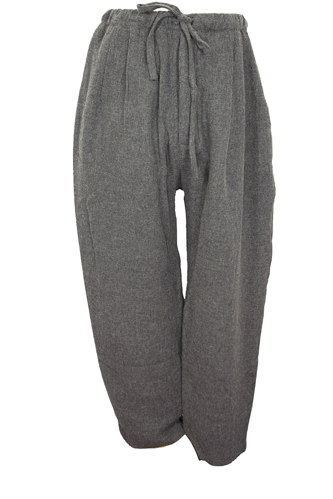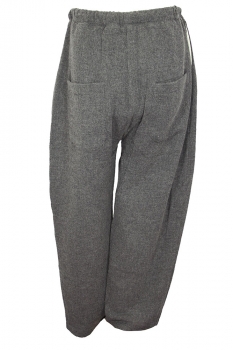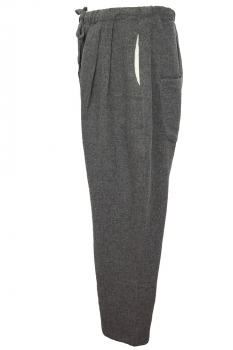 Marc Point wide legged, double pleated, drawstring trousers in grey Viscose/Wool mix. Beautifully soft, comfortable fabric that drapes beautifully. Slightly elasticated waist with grey fabric drawstring. 3 button fly with covering placket. 2 side pockets and 2 rear patch pockets. Plain finished hems. Fully lined in off-white textured fabric. Matches the jacket in the same fabric, creating a magnificent, very cool suit.