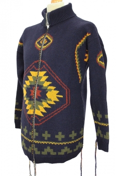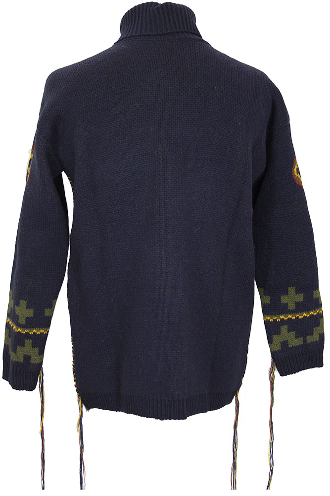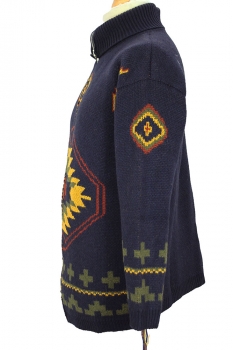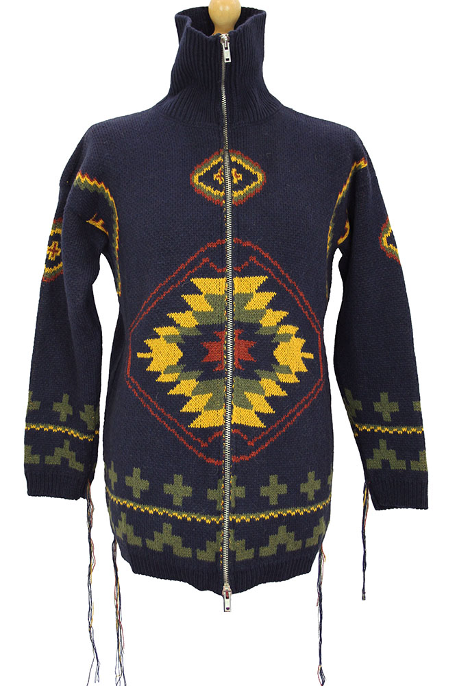 Marc Point Knitted, zip fastening cardigan jacket in a heavy weave. High ribbed collar, which can be turned over. Geometric designs in various colours. Full length double zip down the front. Ribbed hem panel and cuffs. Plain blue rear panel. Loose fibres hanging off the hem and the cuffs. A stunning garment.