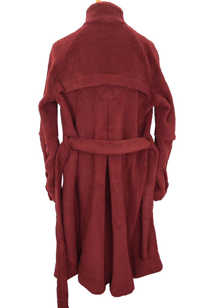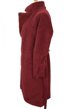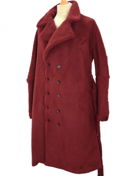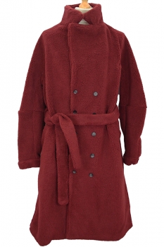 Marc Point heavy, double-breasted, fabric belted coat in teddy bear fabric, burgundy colour. Large, double layered collar and notched lapels. 2 columns of 5 buttons fastening. The front panels are mainly double layered making the garment extra warm. 2 extra cosy pockets. 3 button working cuffs. All inner seams are taped in black. Long fabric belt in the same fabric and belt loops. A wonderful garment, you will be wishing for cold weather with this piece. Generously sized and will fit more than one size.