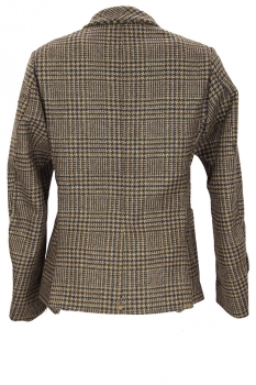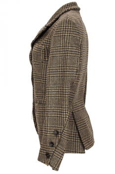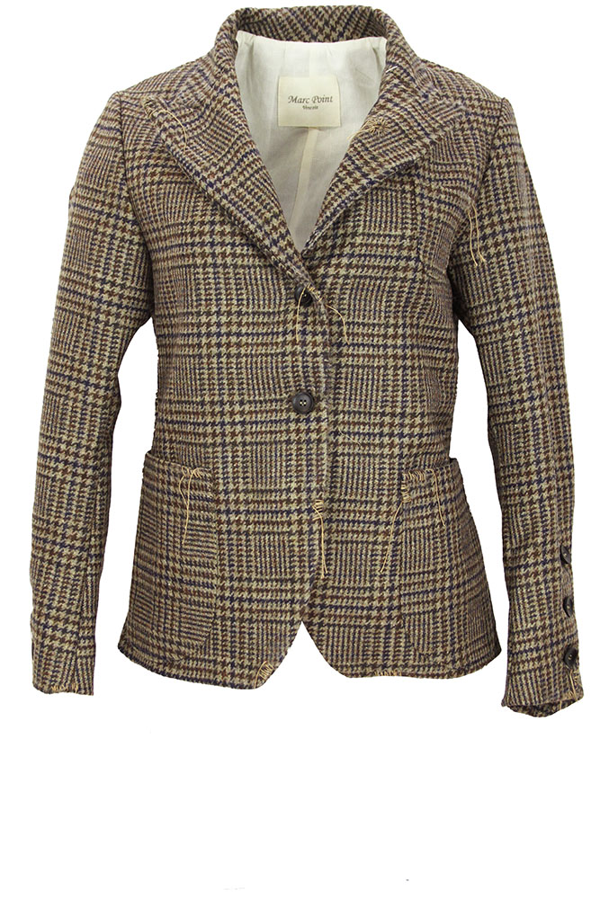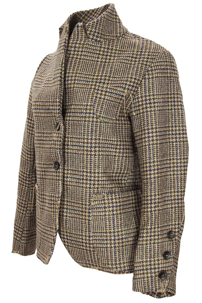 Marc Point 2 button fastening, Womens distressed jacket in a beautiful brown dogtooth check and heavy stitch repairs and trailing stitches. Double layered large collar and notched lapels.Small left chest pocket and 2 main patch pockets. 3 button working cuffs. Double vent at rear. Single inside pocket. Fully lined in off-white textured fabric and the sleeves lined in striped fabric. There are repair stitch details throughout with trailing stitching and subtle distressing. A stunning jacket that matches the trousers and coat in the same fabric. size 42 - Small UK 10