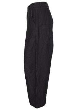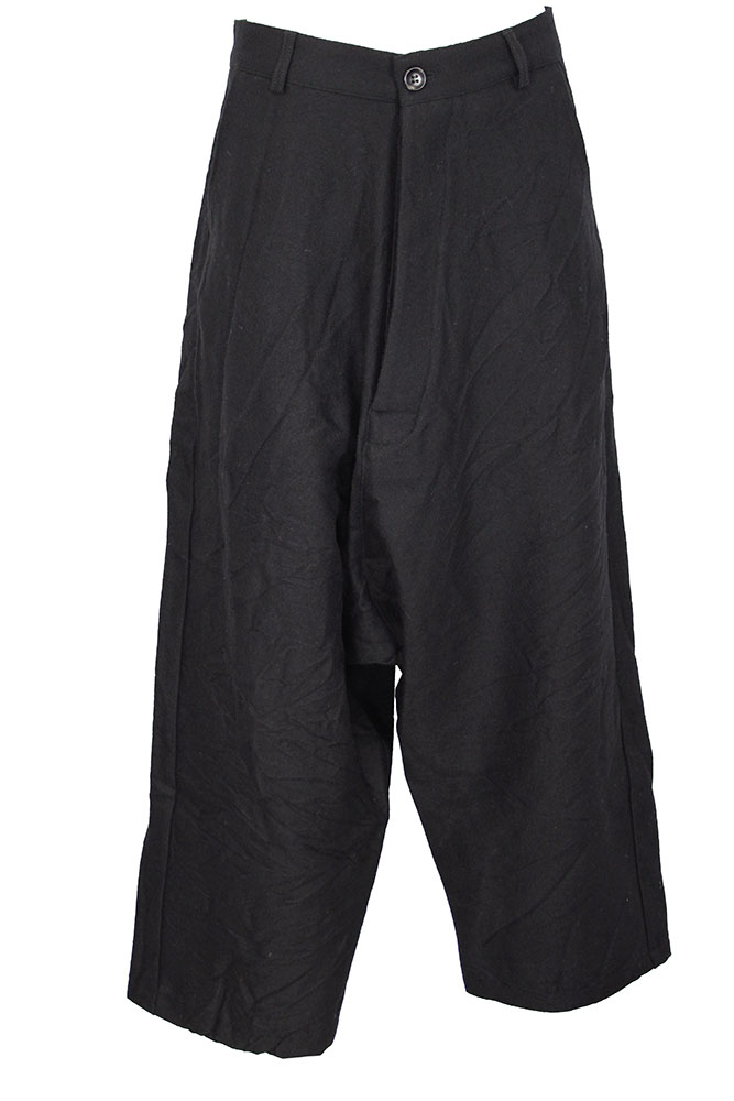 Marc Point low drop crotch, wide legged trousers in crinkled design black wool. Waistband with belt loops and single button fastening. Long fly with 4 buttons and covering placket. 2 angled side pockets and 2 patch pockets at the rear with rounded bases.