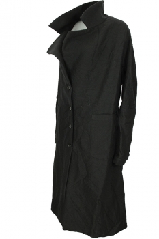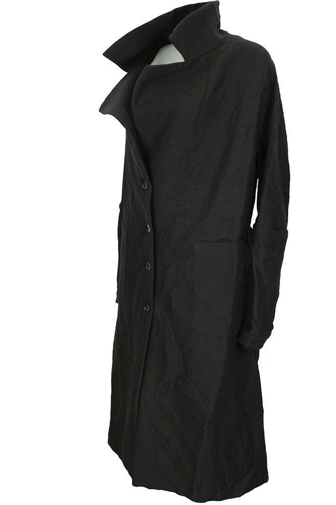 Marc Point 4 button fastening, belted coat in black crinkled wool design. Very large, double layer fabric collar with notched lapels. 2 large patch pockets with curved bases. 3 button working cuffs. Folded fabric panel detail at rear, with box pleat below. Belt loops and plain tie-up fabric belt. A beautiful, full shaped coat. Size 42 but will easily fit a 44.