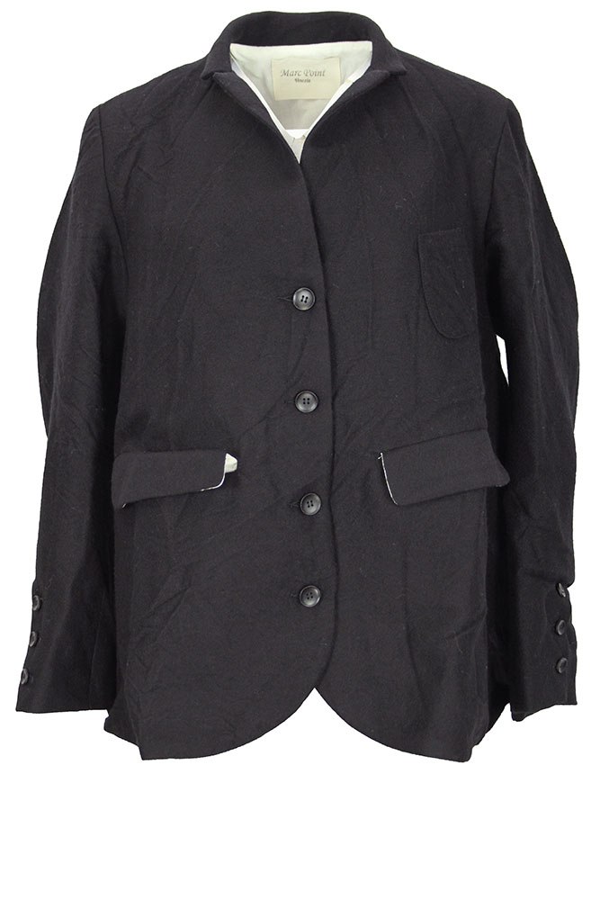 Marc Point 4 button fastening, cut-away style, jacket in black crinkled wool design. Small collar with notched lapels, collar can be worn up. 2 pockets with flaps. A small left chest pocket with rounded base. 3 button working cuffs. Long diagonal vent at rear with button fastening. Fully lined in textured off-white fabric. sizes 8 and 10 Uk 40 and 42 Italian