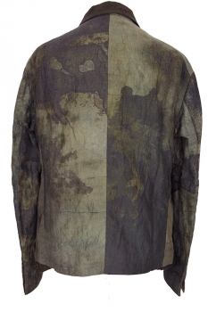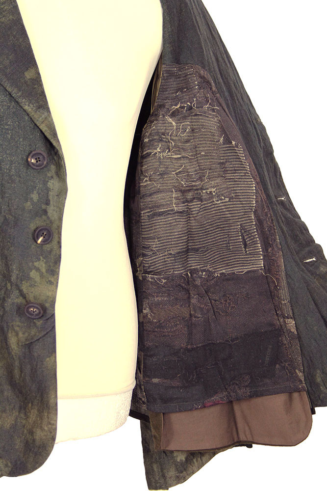 Ziggy Chen 3 button jacket in a distress print. Collar with notched lapels, the upper collar is in a block brown fabric, the lower lapels are in the printed fabric. The garment can be buttoned up to the neck, with the lapels up. The 3 button fastenings are staggered to gather the fabric slightly. Left chest pocket. 2 main pockets with flaps. 5 button working cuffs. The front panels are longer than the rear, where the hem curves upwards, the base of the inner pockets are revealed below the hem. Fully lined. As usual this garment is impeccable in its construction and design and of the very finest quality. Exceptional.