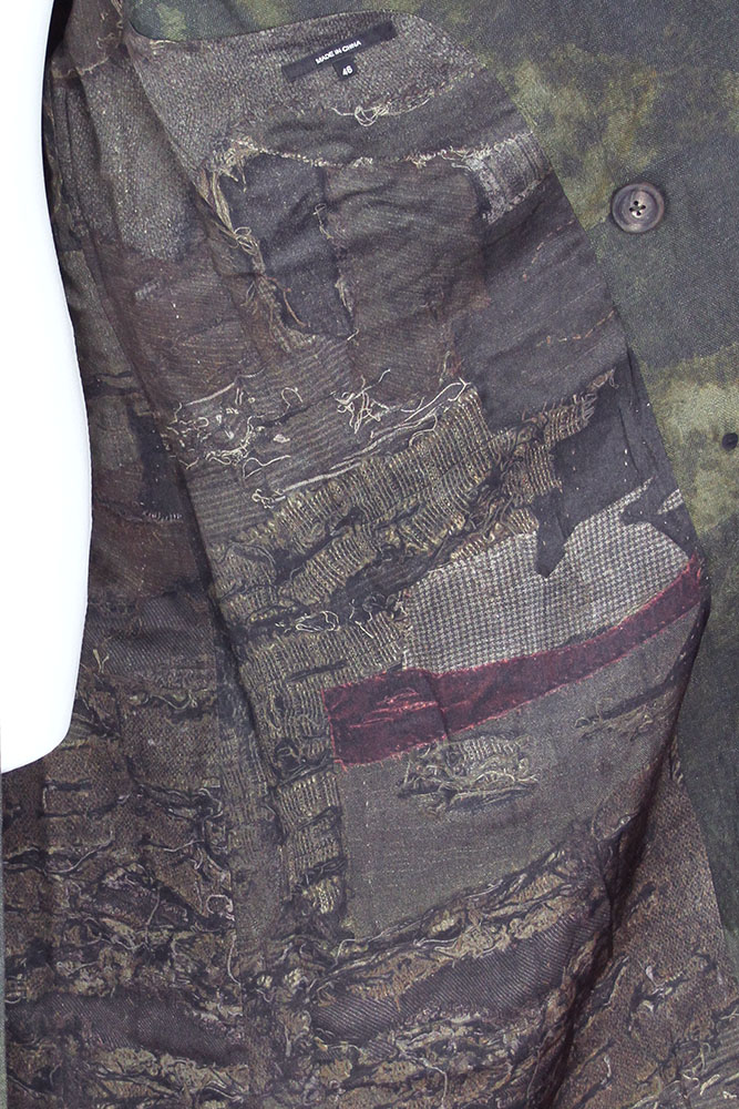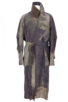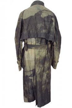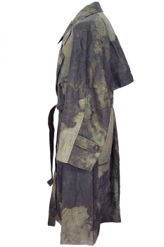 Ziggy Chen double-breasted, belted coat in a distress print. Large collar, with large notched lapels. 2 columns of 3 buttons fastening and double layered fabric belt, the back of the belt is in a brown khaki fabric, the front is in the distress print. 2 large concertina pockets with flaps and button fastening under the flaps. Long central vent at the rear. Over laid cape at rear shoulders and upper back, this is lined. Fully lined inside in soft print fabric and the sleeves in distressed striped fabric. An awesome coat is a brilliant fabric, as good as it gets!! Generously sized will fit up to a large.