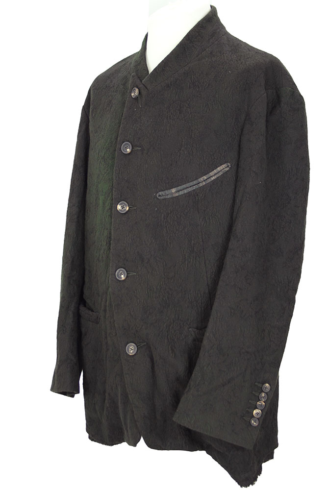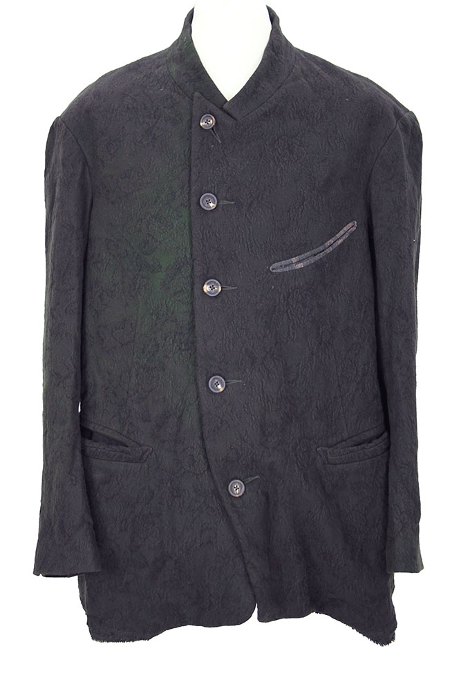 Ziggy Chen 5 button, mixed brocade fabric jacket in cotton/wool mix. High neck with notches. The left front panel is curved with the button fastenings fooling the curve and is in a rich, dark brocade. the right panel in in a dark petrol coloured brocade. 5 button fastening. Curved, left chest pocket with print fabric trim and inside button and loop fastening. The 2 main pockets have a finishing trim. 5 button working cuffs. Central vent at rear. The front panels are slightly longer than the rear panels. The side hems have raw edged panels, extending below the hem. Fully lined in printed silk and the sleeves in distressed striped fabric. Single pocket with flap and button fastening inside.