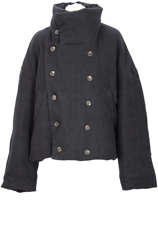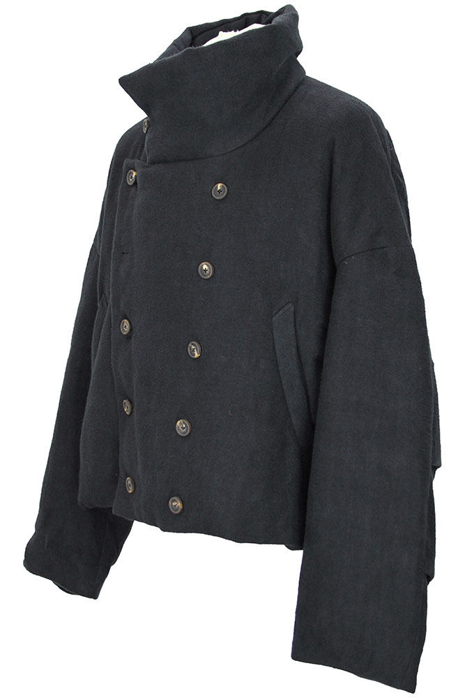 Ziggy Chen padded, goose down filled, double-breasted jacket in super soft fabric. High padded collar. 2 rows of 5 buttons fastening and a single button and loop fastening at neck. 2 angle pockets with trim. Turned cuffs. Curved panel insets at rear. Fully lined in printed silk and with a single inside pocket with flap and button fastening. Sleeves are lined in distressed striped fabric. A superb winter jacket which will fit many sizes, I am a size 52IT and it fits me perfectly, works well is oversized, so do not be put off by the small size label, as often with Ziggy Chen the garments are beautifully oversized.