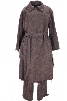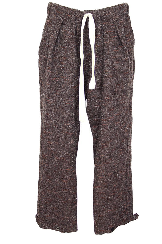 Klasica 'Souk' trousers in regenerated Kemp mixed tweed in mix brown colour. Elasticated waistband with natural coloured drawstring. Single pleated. 2 side pockets and a single rear pocket with finished trim. Finished hems with fabric tab and button adjustments. Lined in black to below the knees. These trousers match the other garments in the same tweed fabric.
