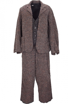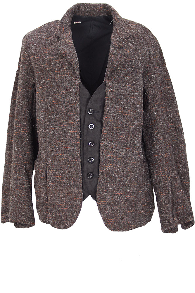 Klasica 'Ardoise' Jacket in regenerated Kemp mixed Tweed fabric.'Collar with notched lapels and button fastening at neck. 5 button fastening on black inset panels giving the effect of a waistcoat. Cut-away style. 2 pockets either side of the button panels, hidden in seams. 2 main pockets with finishing trim. Curved vented cuffs. Small patch pocket inside. Fully lined in black.