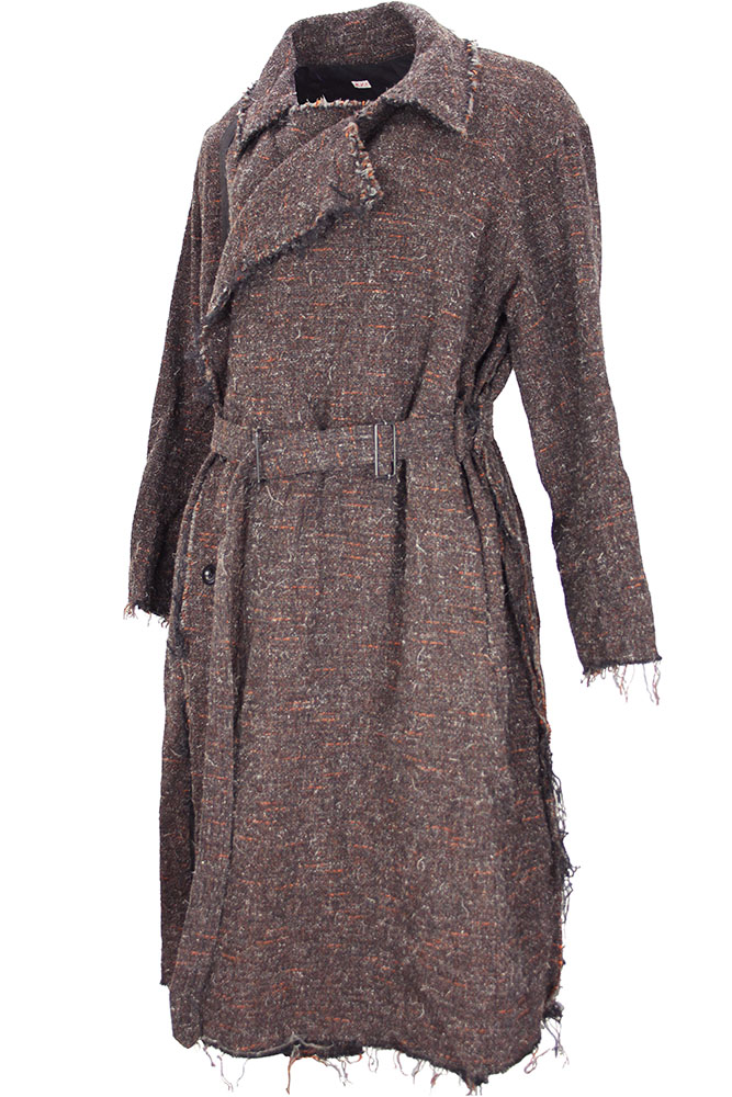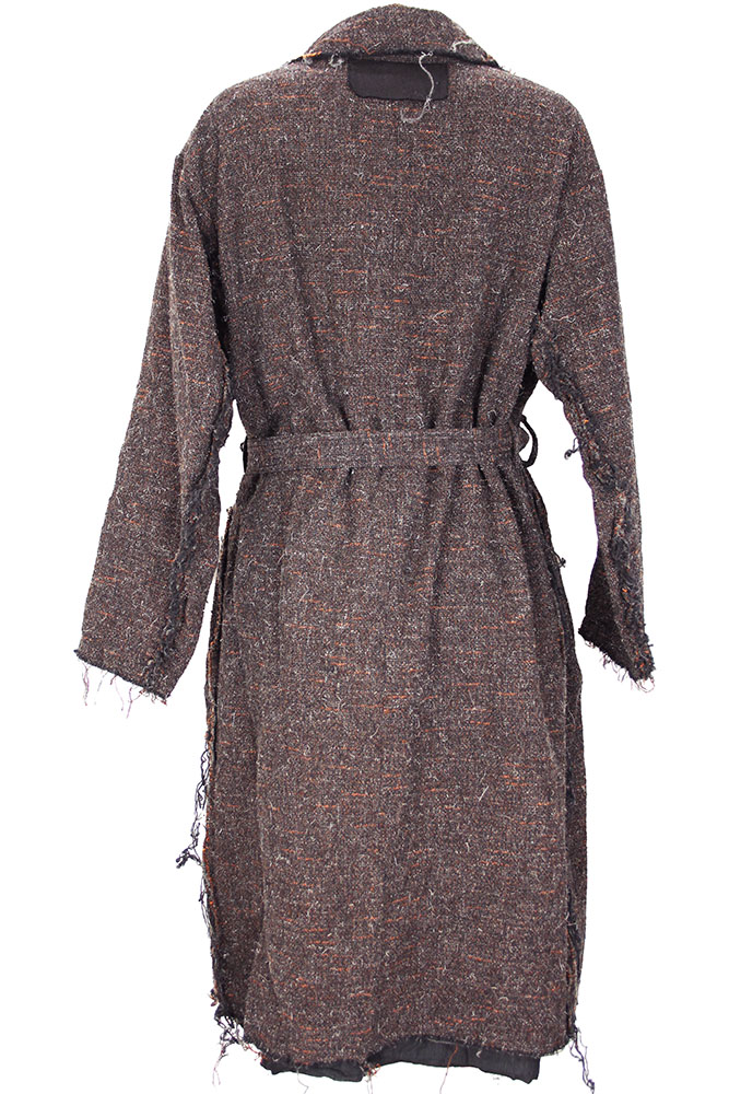 Klasica 'HM-C' double-breasted Coat in regenerated Kemp mixed Tweed fabric. Generously sized. Large collar with deep notched lapels and raw edged fringing, the lapels are double layered and the collar backed in black fabric. There is a button on the right side of the collar to allow the garment to be buttoned up to the neck. 3 button fastening, including the button at the collar, the buttons are attached to the garment via a black band, which extends from the shoulder to the hem. There is a single button fastening inside. Belt loops and fabric belt with metal buckle. 2 pockets. The cuffs are raw edged fringed with black lining. Seams are all reversed with raw edging, as are all the edges on the garment. Black rectangular patch at rear of neck. Fully lined in black cotton and there are 2 inside patch pockets. A wonderful coat in an awesome fabric, matches the other garments in the same fabric. Great with the belt or without.