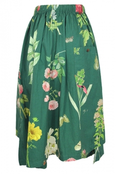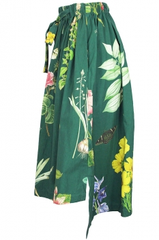 Aleksandr Manamis asymettric print fabric skirt in Jardin vert print. Gathered elasticated waist, with fabric tie. Highly gathered at the waist. 2 side pockets. There are vents at each side and the rear is longer on the right and the front is longer on the left. Beautiful and interesting skirt. Very full.
