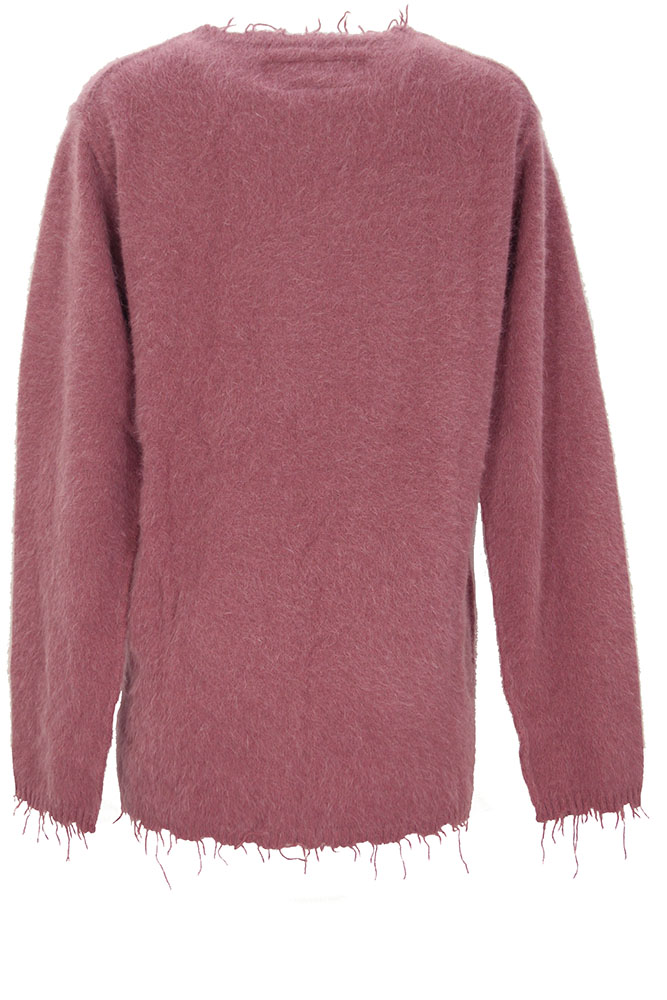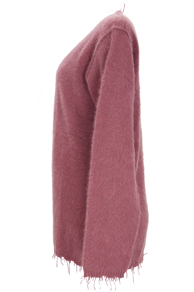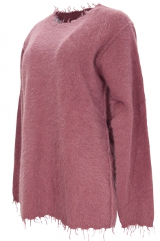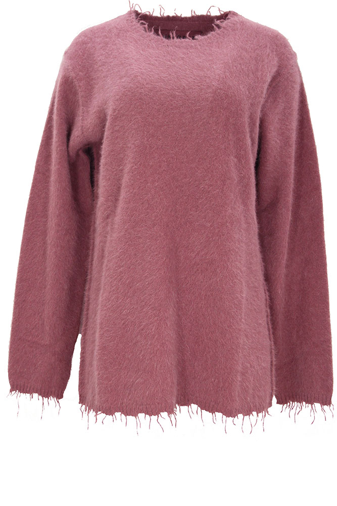 Rundholz Dip Collection generous sized, knitted pullover in Fox wool, mercerised wool and silk in flamingo colour (mauve pink). Round neck with ribbed trim and fringe. Long sleeves with ribbed cuffs and fringe. Hem with ribbed finish and fringe. Seam details at each side. The Fox wool comes from brushed underbody hair, the wool is treated to improve strength and dye take up (mercerised) and the silk adds additional luxury and strength. beautiful texture.