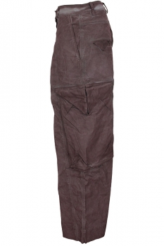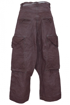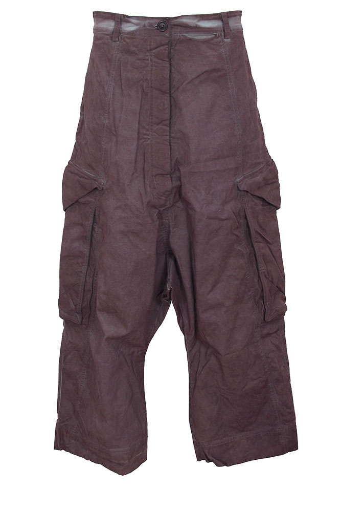 Rundholz Dip Collection Overdyed, heavy fabric, low drop crotch trousers in flamingo cloud colour (dark mauve). Waistband with belt loops and single button fastening, additional button fastening inside. Long fly with 6 button fastening and covering placket. 2 side pockets and 2 rear pockets with folded fabric tab and button fastenings. Large side thigh pockets with folded fabric corners and folded fabric, triangular shaped flaps and button fastening.