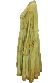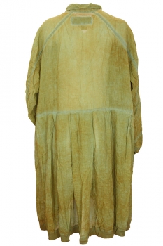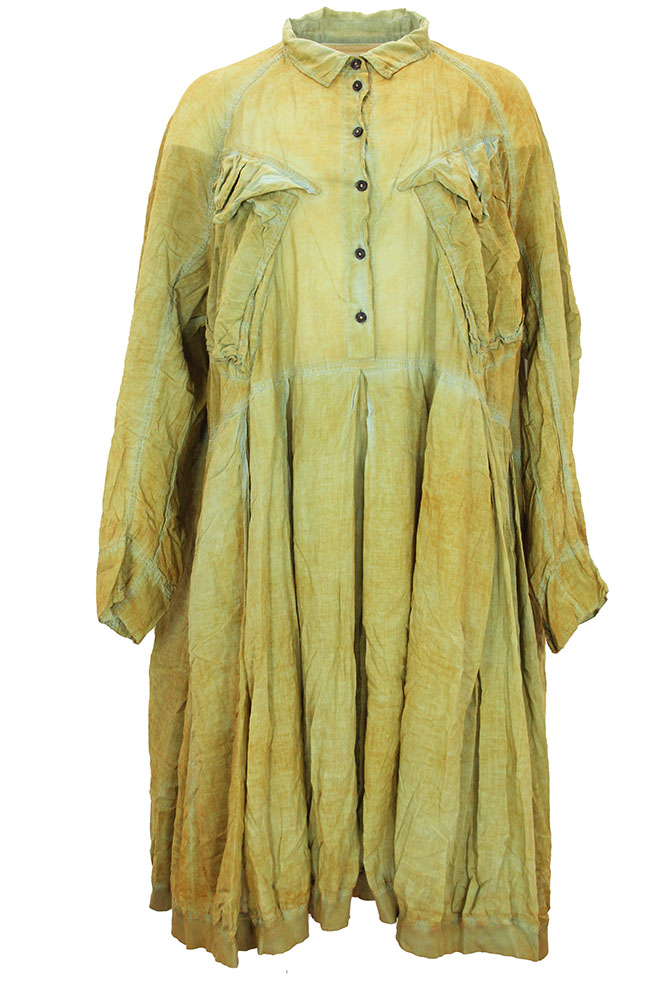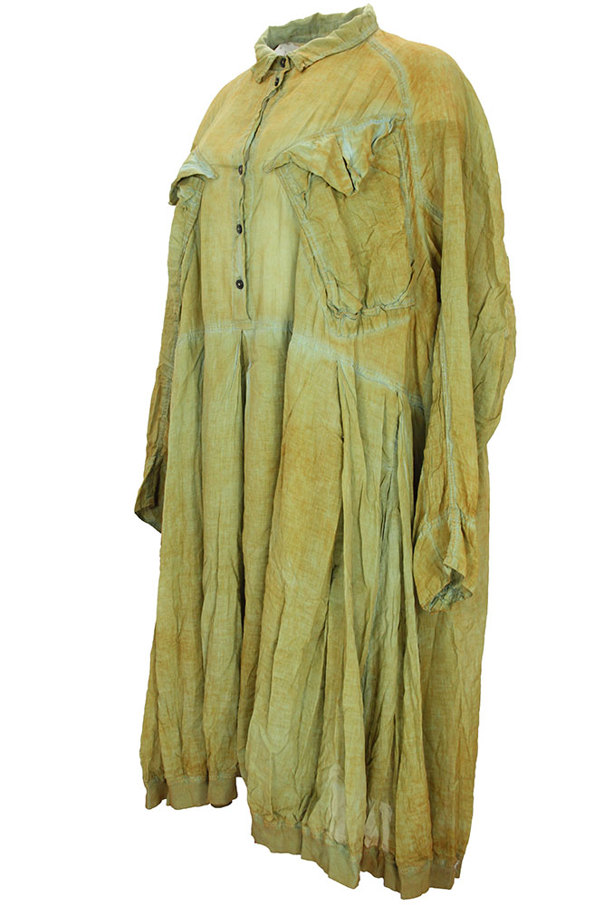 Rundholz Dip Collection Overdyed, oversized, wide, two-tone, long-sleeved sheer, cotton dress in lagoon cloud colour. Small collar, with button fastening. A further 5 buttons fastening to waistband. 2 angled patch, concertina style pockets on chest with folded fabric flaps and button fastening. Long sleeves with finished cuffs and triangular, folded fabric tab and button fastening. The skirt section is wide to give a wonderful hang and has deep box pleats all around, making the skirt quite substantial and with a beautiful hang, with 2 side pockets. The hem is curved and has a knitted, ribbed, stretch fabric panel all around. A stunning dress.