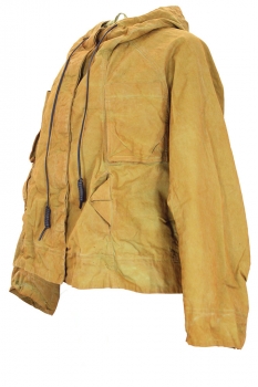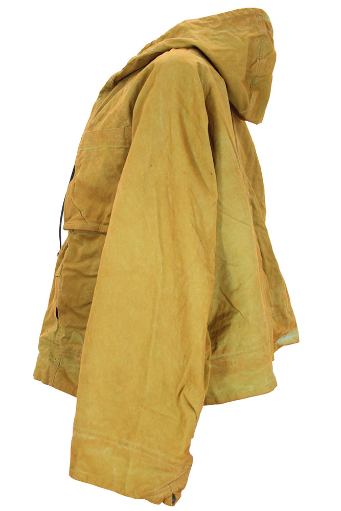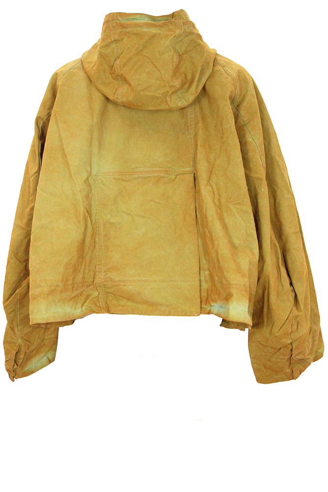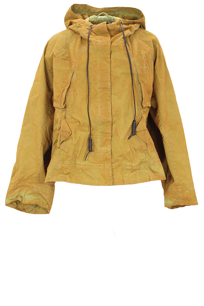 Rundholz Dip Collection Overdyed, two-tone, heavy stretch fabric, wide bodied, short hooded jacket in lagoon cloud colour. Hood with black leather, knotted drawstring, hood is lined in overdyed cotton. 5 button fastening down the front, with covering placket. 2 angled, concertina style upper chest, patch pockets, with finished trim and triangular insert on lower corners. 2 additional pockets with folded fabric triangular tab and button fastening. Very wide arms, with finished cuffs and folded fabric, triangular tab and button fastening. Slightly longer at the rear, with offset vent. Fully lined in overdyed cotton.