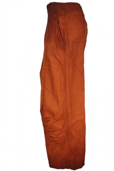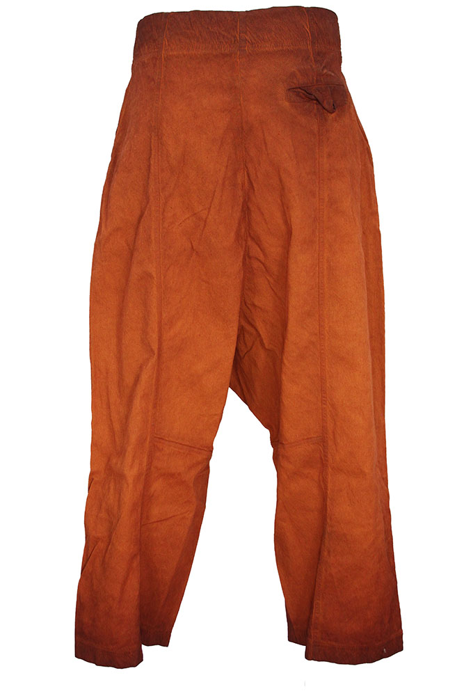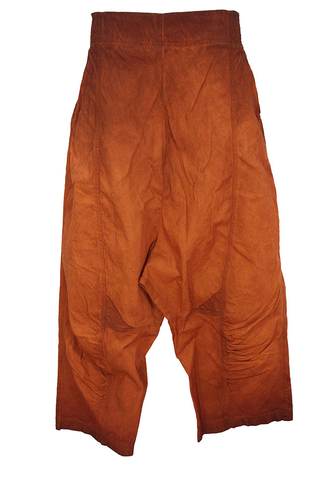 Rundholz Dip Collection Overdyed, distressed, stretch fabric, pull-on, low drop crotch, wide legged trousers in crab reverse colour (rusty orange). Panel construction. Deep waistband. 2 side pockets with finishing trim and a single rear pocket with folded fabric, triangular tab and button fastening. Articulated and ruched legs, with triangular fabric inserts. Finished hems.