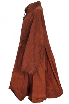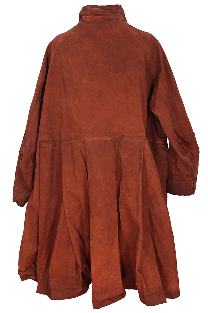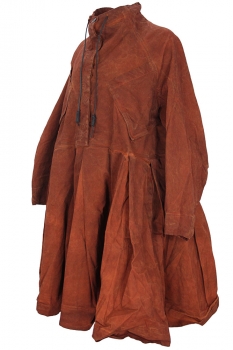 Rundholz Dip Collection Overdyed, oversized, heavyweight fabric, long sleeved dress in crab cloud colour (dark rusty orange). Round neck with black leather drawstring, to ruche the neckline and single button fastening. Additional 4 button fastening to waist, with covering placket. 2 angled concertina style chest pockets, with finished trim and triangular inserts at the base. The skirt section is very wide with large box pleats all around, making the already wide garment even more full. 2 side pockets. Deep hem panel. Deep cuffs with folded fabric, triangular tab and button fastening. A stunning piece.